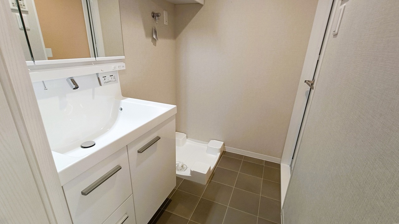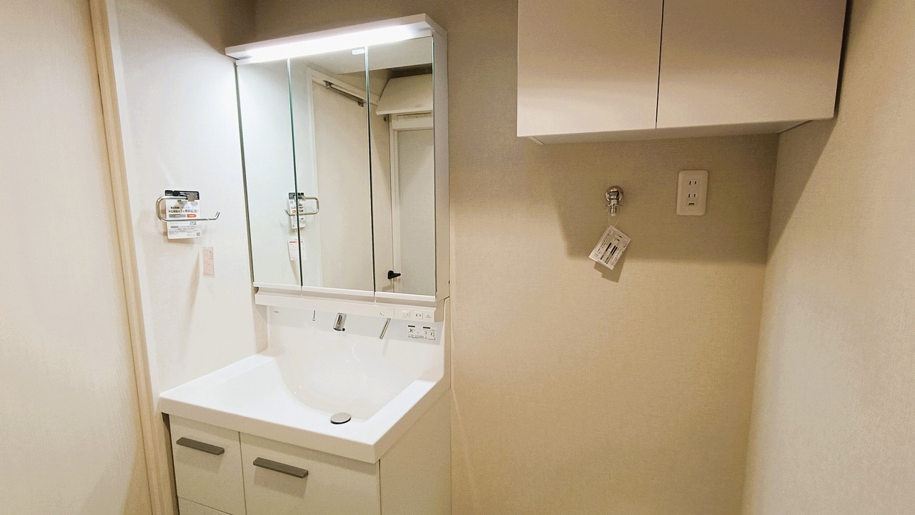 三面鏡を採用した洗面化粧台。鏡の裏にも収納スペースがあります。