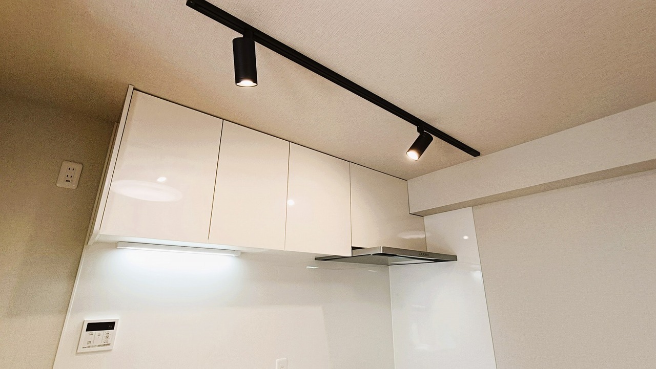 手を伸ばせばそこに収納が。安定した使用感の吊戸棚つきのキッチン空間。