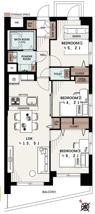 | 間取 | 3LDK (LDK13.5帖、洋室5.2帖、洋室5.2帖、洋室4.2帖) | ||