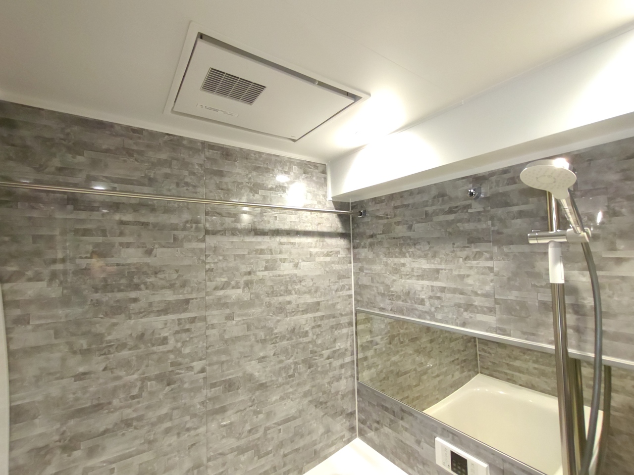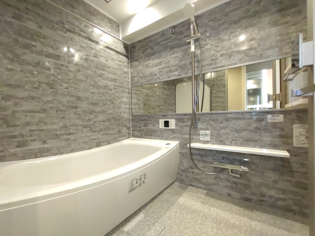 石目調の壁が落ち着きと洗練された空間を演出するバスルーム。