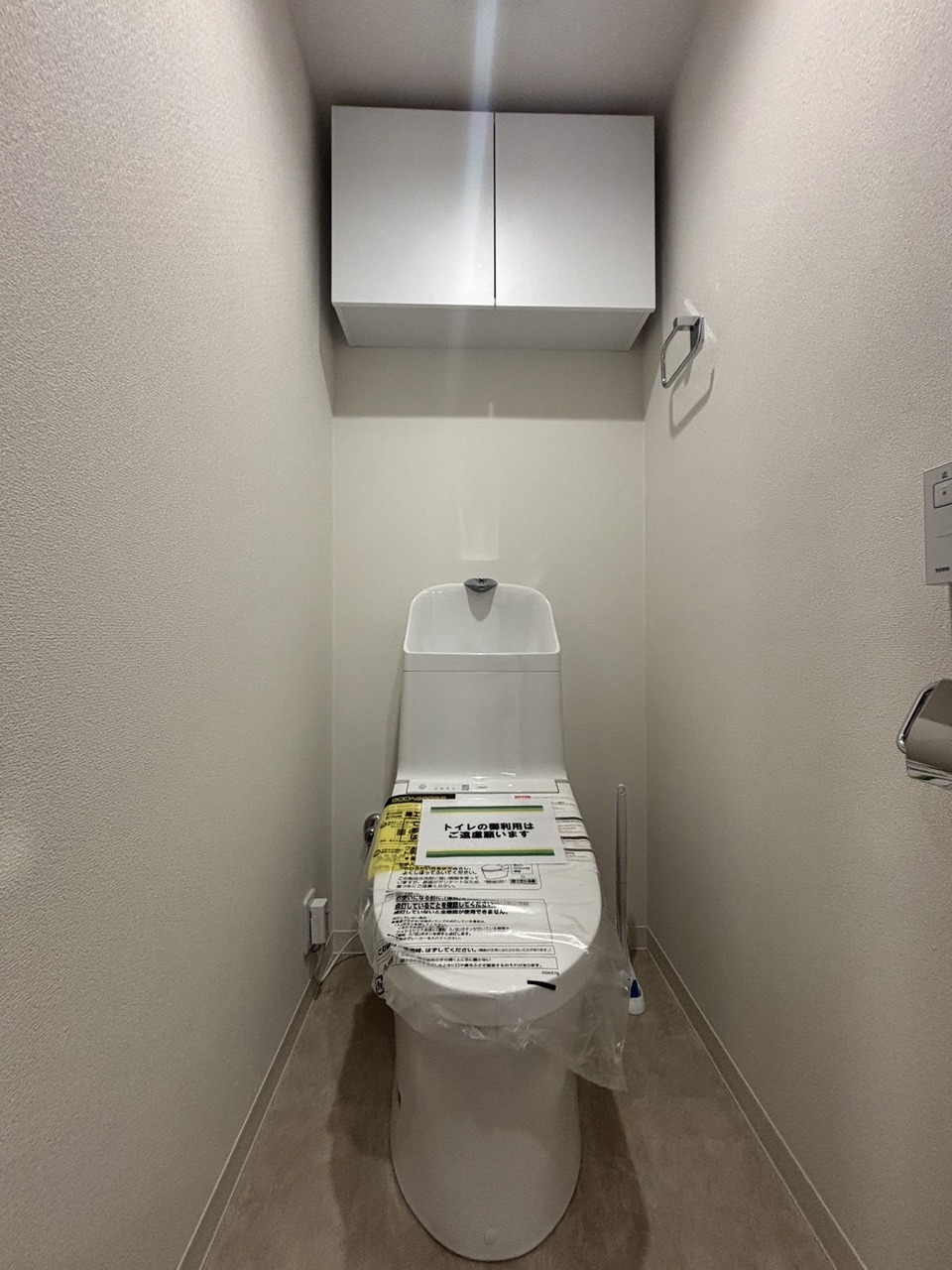 ウォシュレット機能付きのトイレ。収納もあり実用性も兼ね備えた造り。