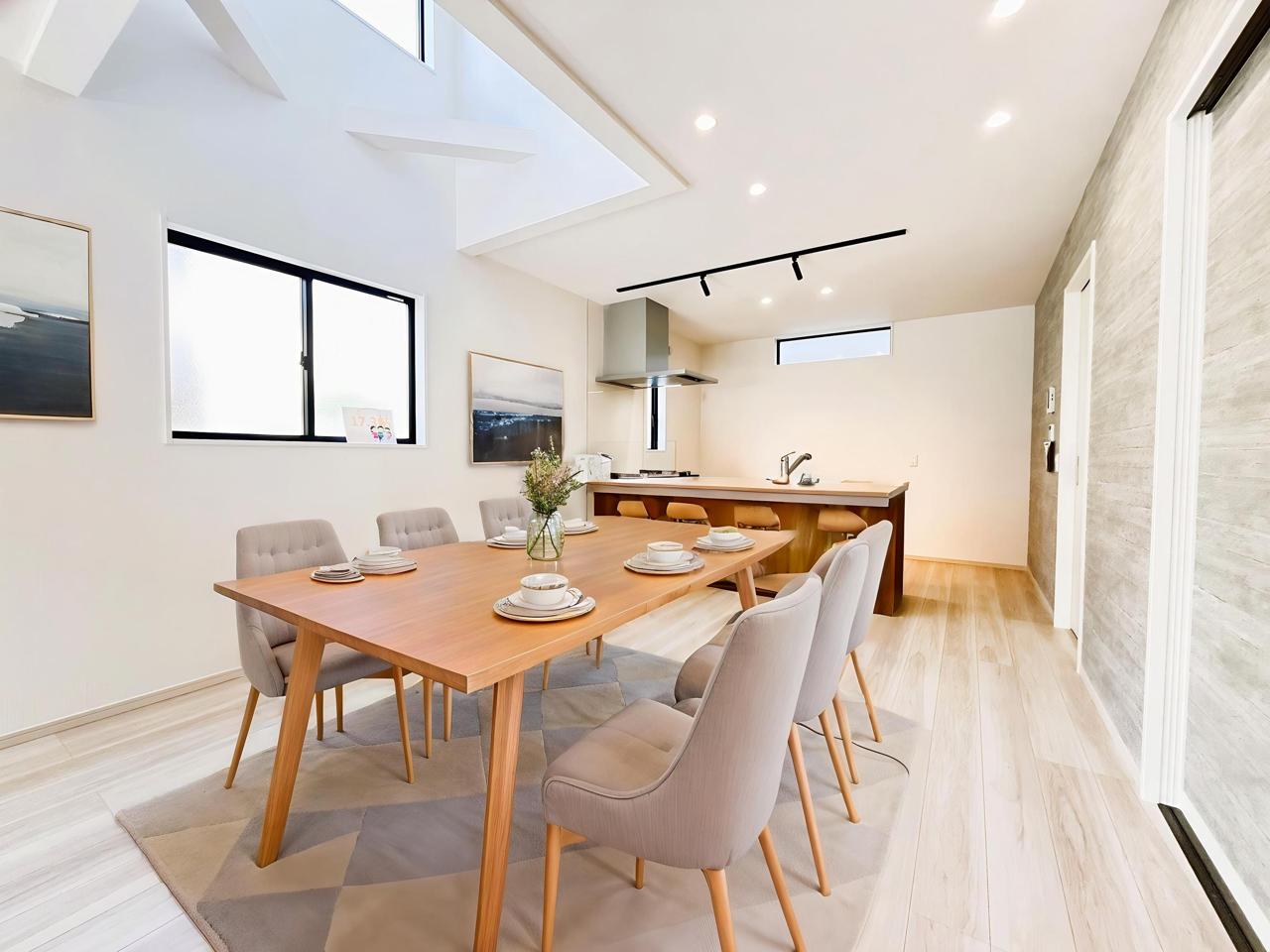 家族団欒のリビング。陽光差し込む食卓には家族の会話とスマイルが溢れます。いつまでもここで食卓を囲みたくなる、そう感じさせてくれるスペース。