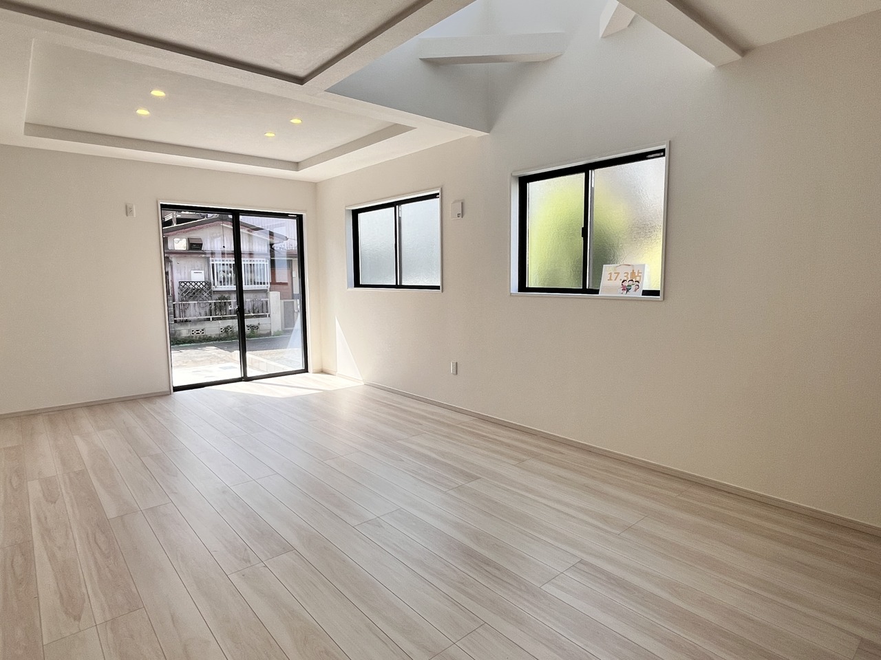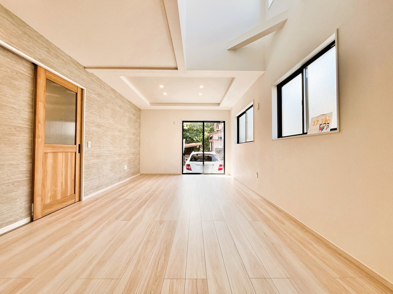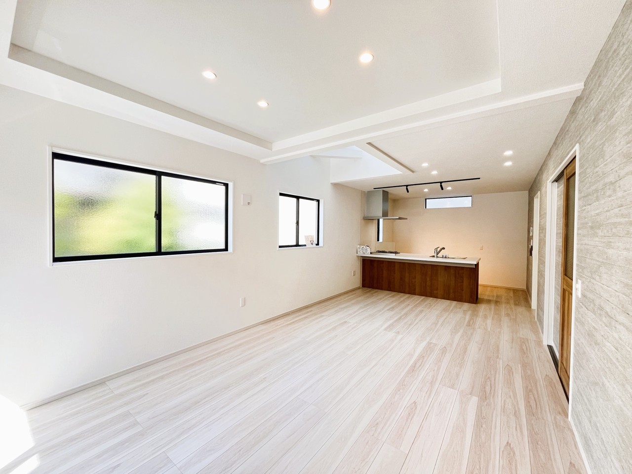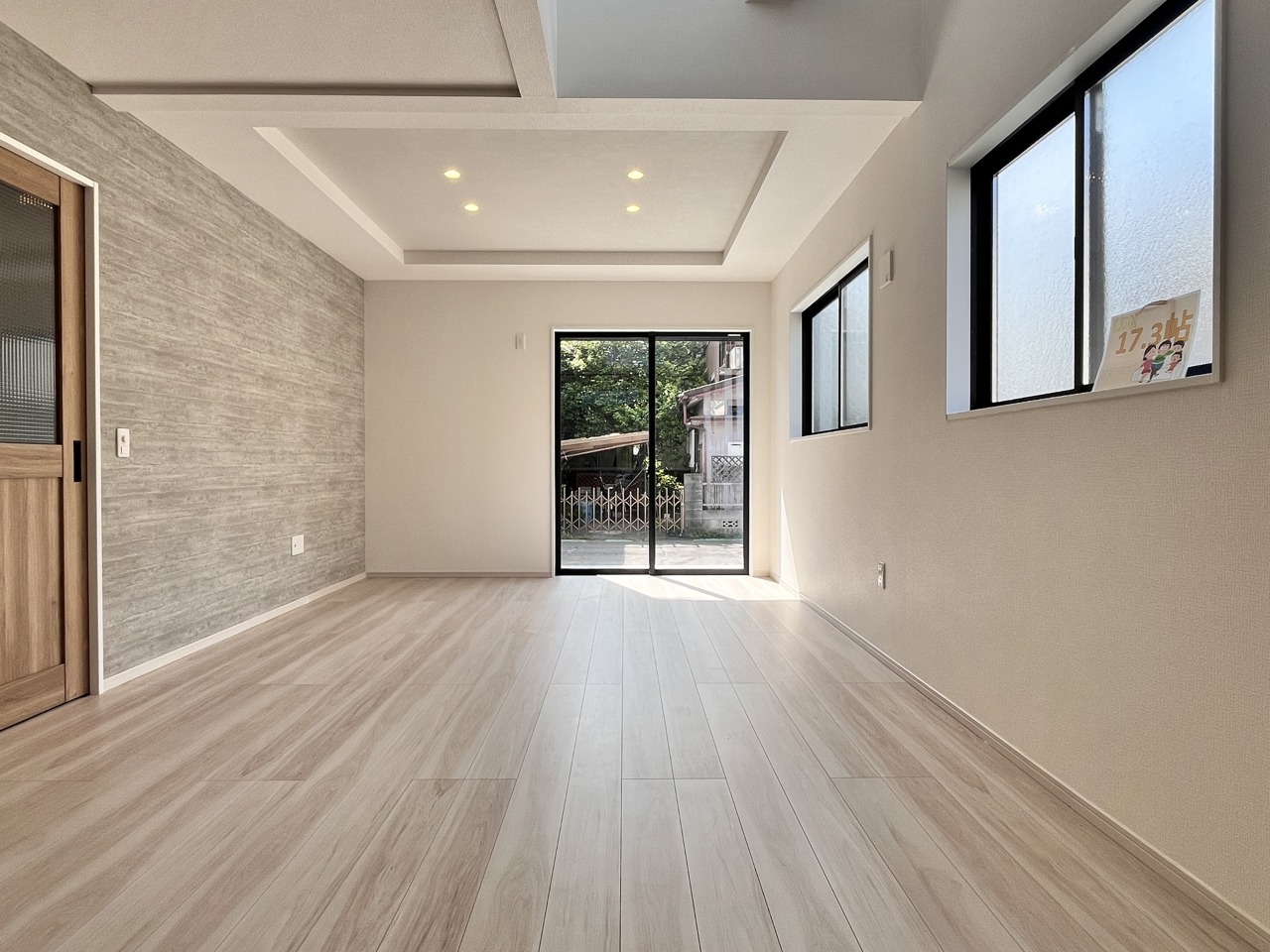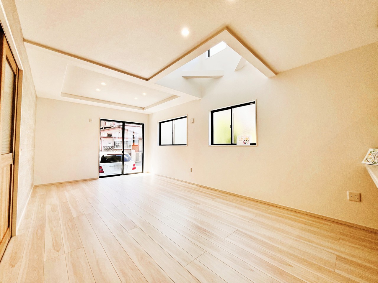 新建の空気感あふれる空間は、柔らかな光に満たされ、広々とした床には木目の風合いが温かく、開放的な窓からは心地よい風が吹き抜けるような開放感を覚えます