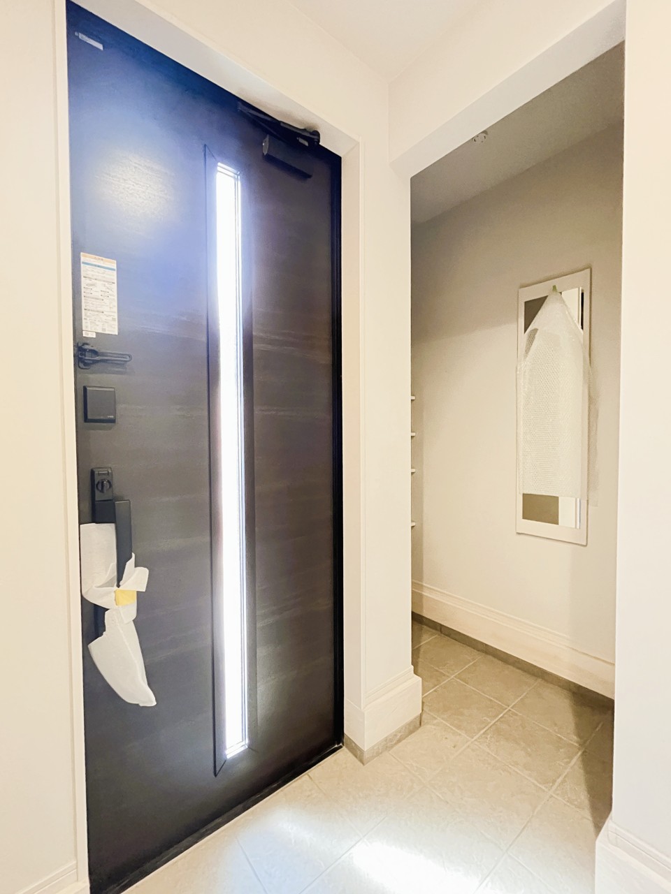 お宅の顔となる明るく開放的な玄関。ご家族皆様様の靴を収納できるスペースと全身鏡があり、お出掛け前に身だしなみチェックもできます。