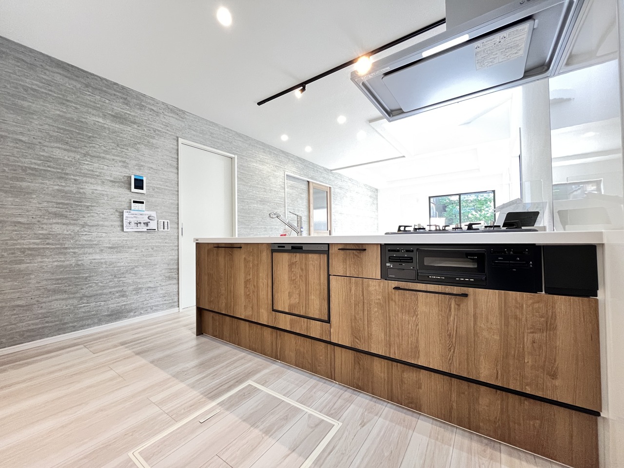 上質な木目調と表情豊かな壁が、洗練されたキッチン空間を演出します