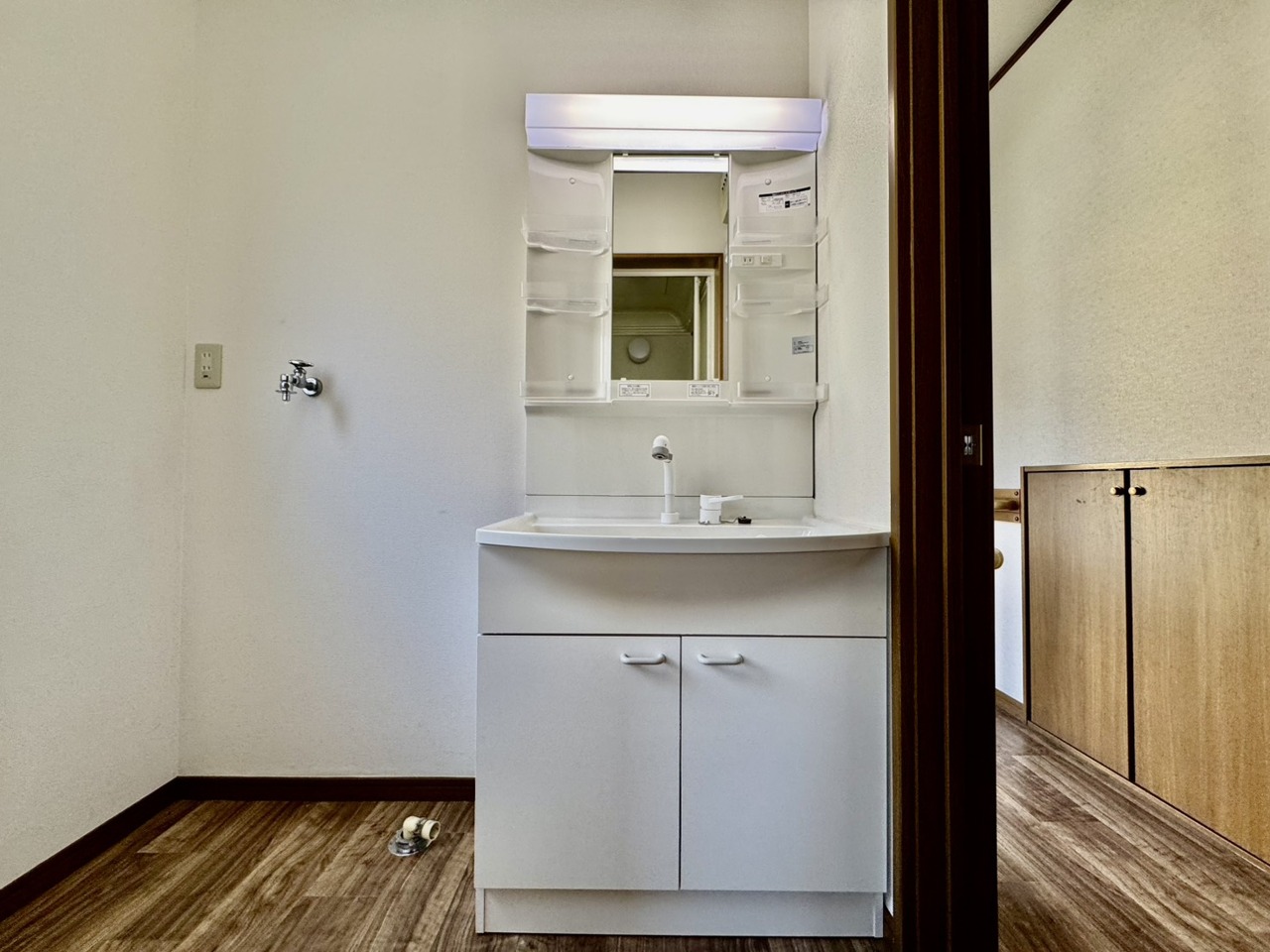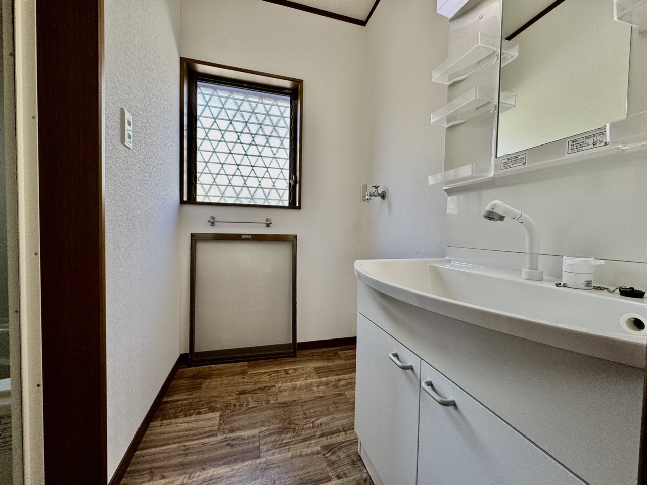 リフォーム工事前。ワイドなボウルにハンドシャワー水栓が付いた洗面化粧台。