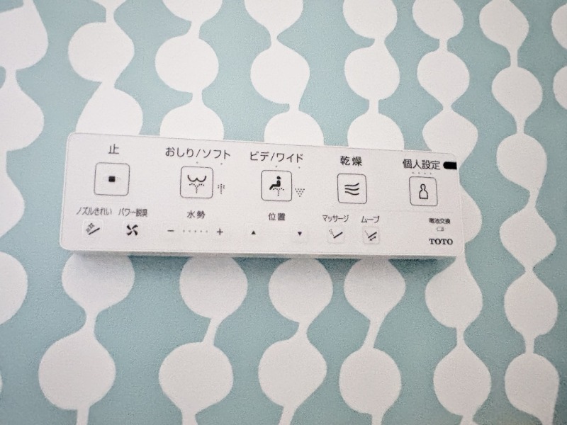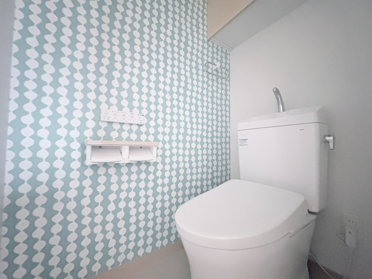 水玉模様の壁紙が、空間に軽やかな彩りを添えています。