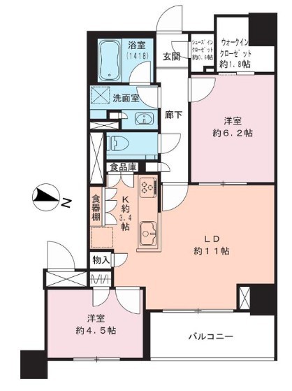 | 間取 | 2LDK (LDK11帖、K3.4帖、洋室6.2帖、洋室4.5帖) | ||