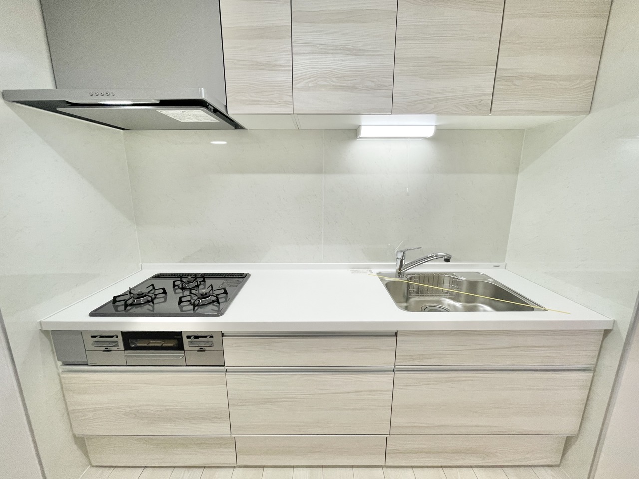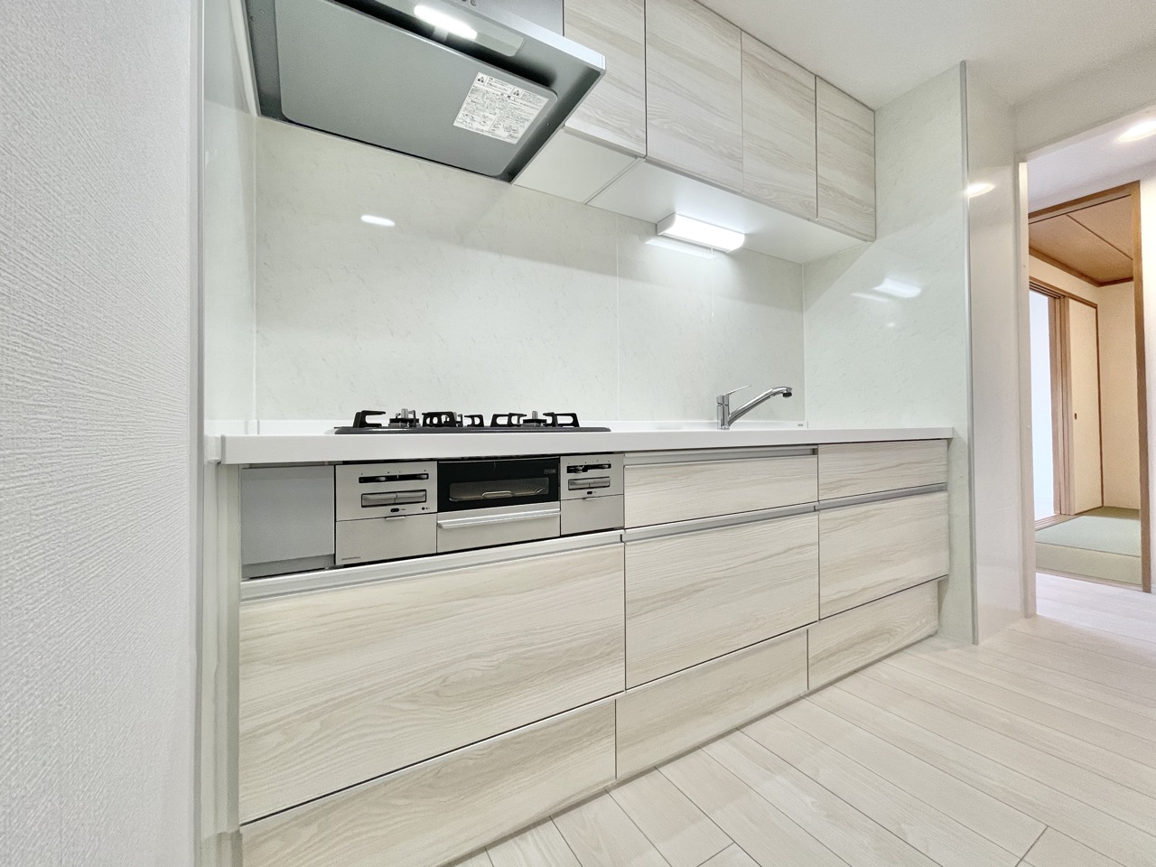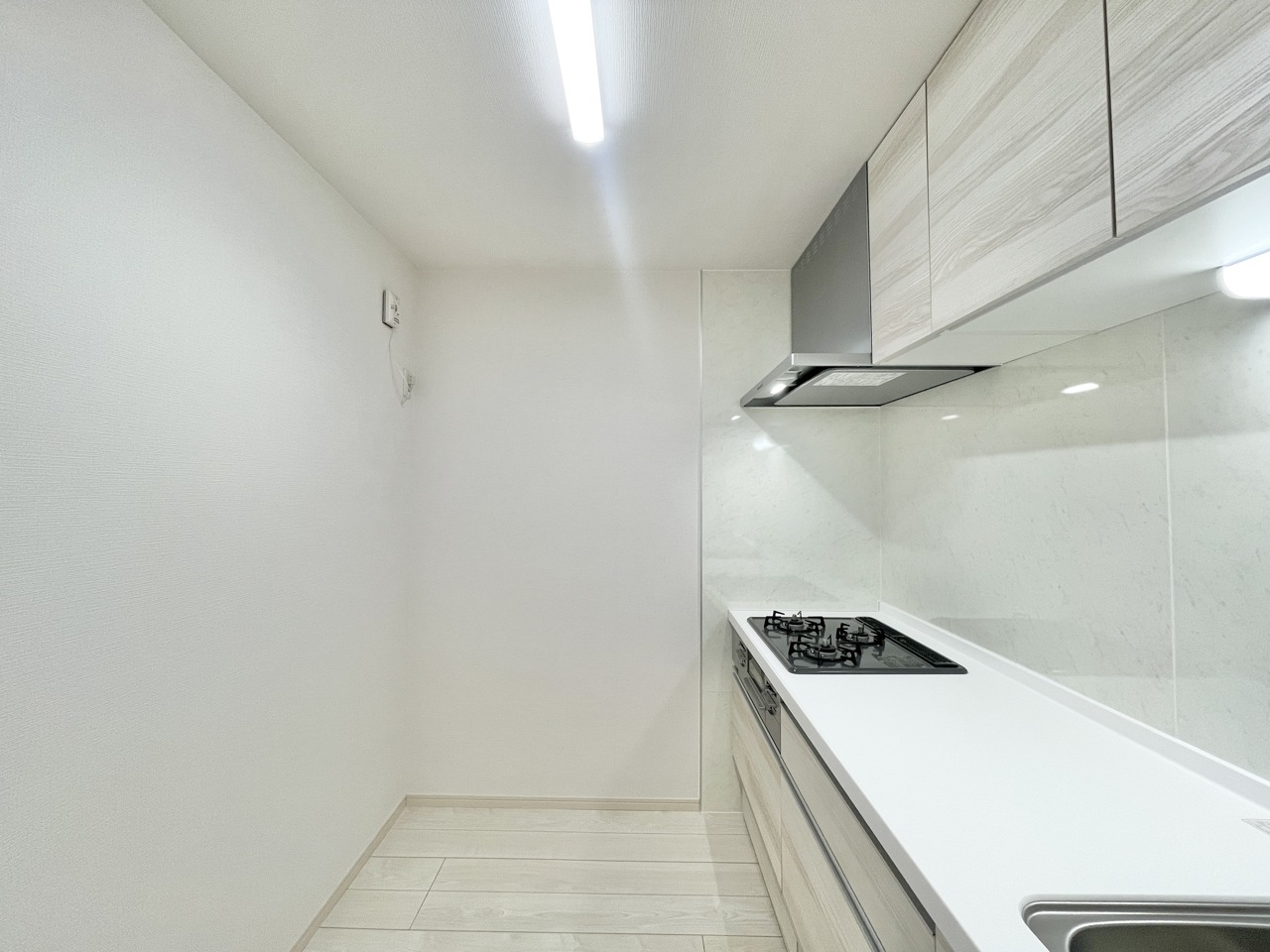 温もりある木目調と清潔感のある白が調和する、機能的な空間。