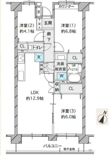 | 間取 | 3LDK (LDK12.9帖、洋室6.8帖、洋室6.0帖、洋室4.1帖) | ||