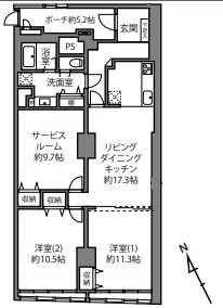 | 間取 | 2SLDK (LDK17.3帖、洋室11.3帖、洋室10.5帖、S9.7帖) | ||