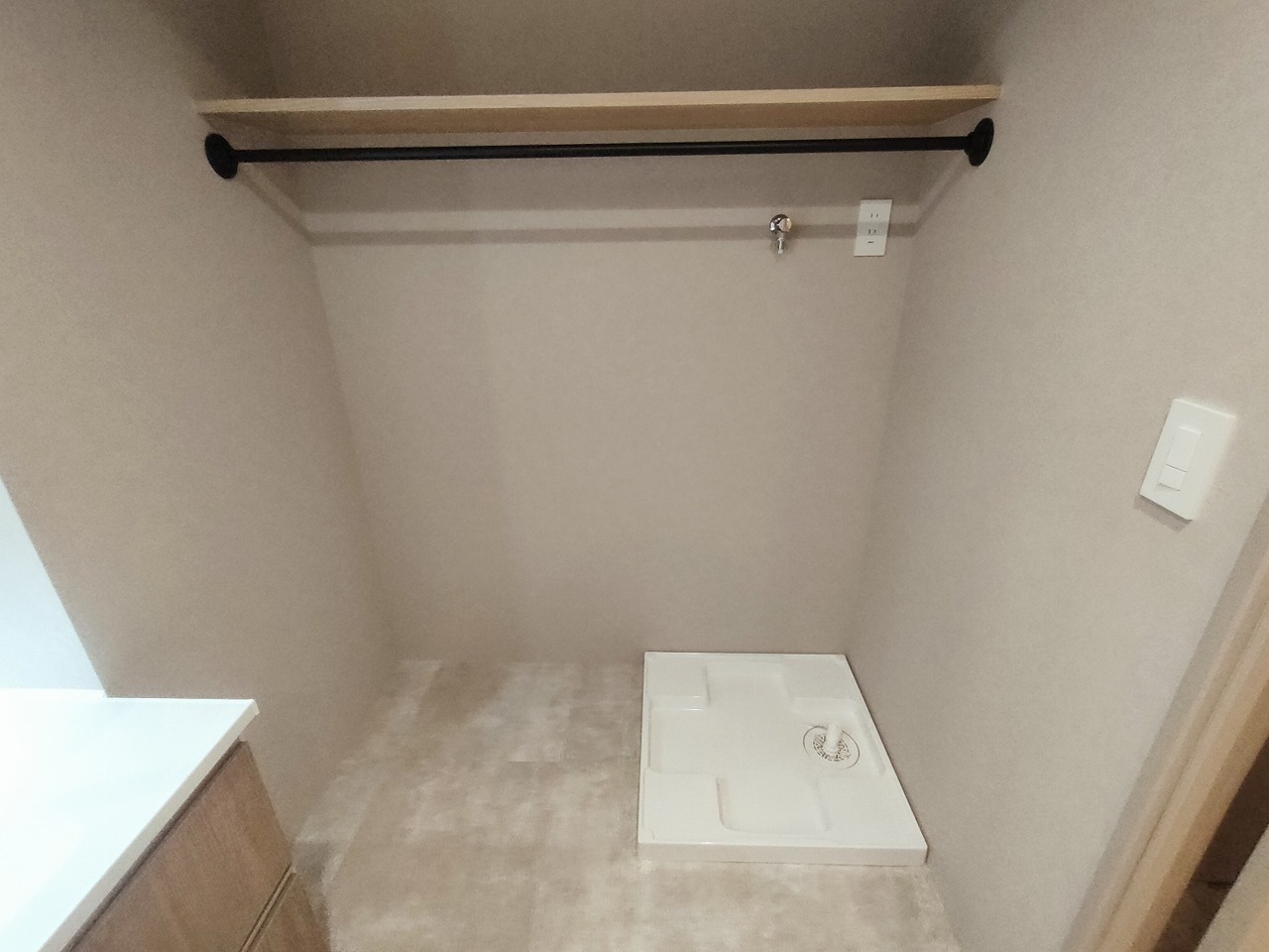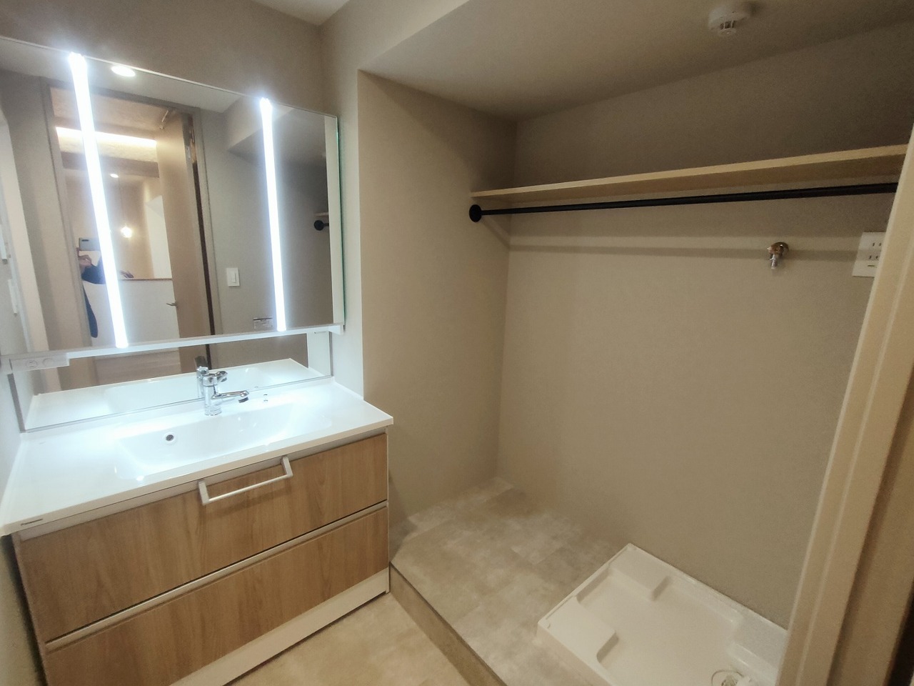 収納豊富な三面鏡付洗面化粧台。水回りのあれこれがキレイに収まりそうですね。