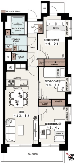 | 間取 | 3LDK (LDK13.8帖、洋室6.0帖、洋室5.4帖、洋室4.5帖) | ||