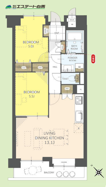 | 間取 | 2LDK (洋室5.5帖、洋室5帖、LDK13.1帖) | ||