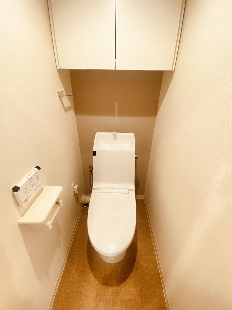ウォシュレット機能付きのトイレ。収納もあり実用性も兼ね備えた造り。