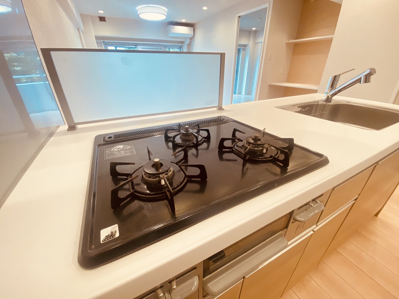 リビングにいる家族の顔が見渡せるカウンターキッチン。お料理もより一層おいしく、楽しく。食器棚を背面に設置しても十分な広さを確保しています。