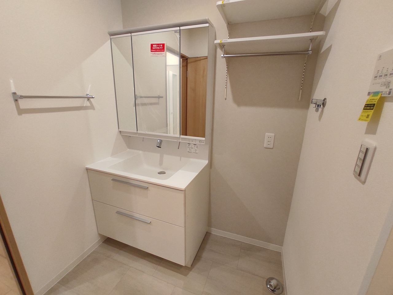 三面鏡を採用した洗面化粧台。鏡の裏にも収納スペースがあります。