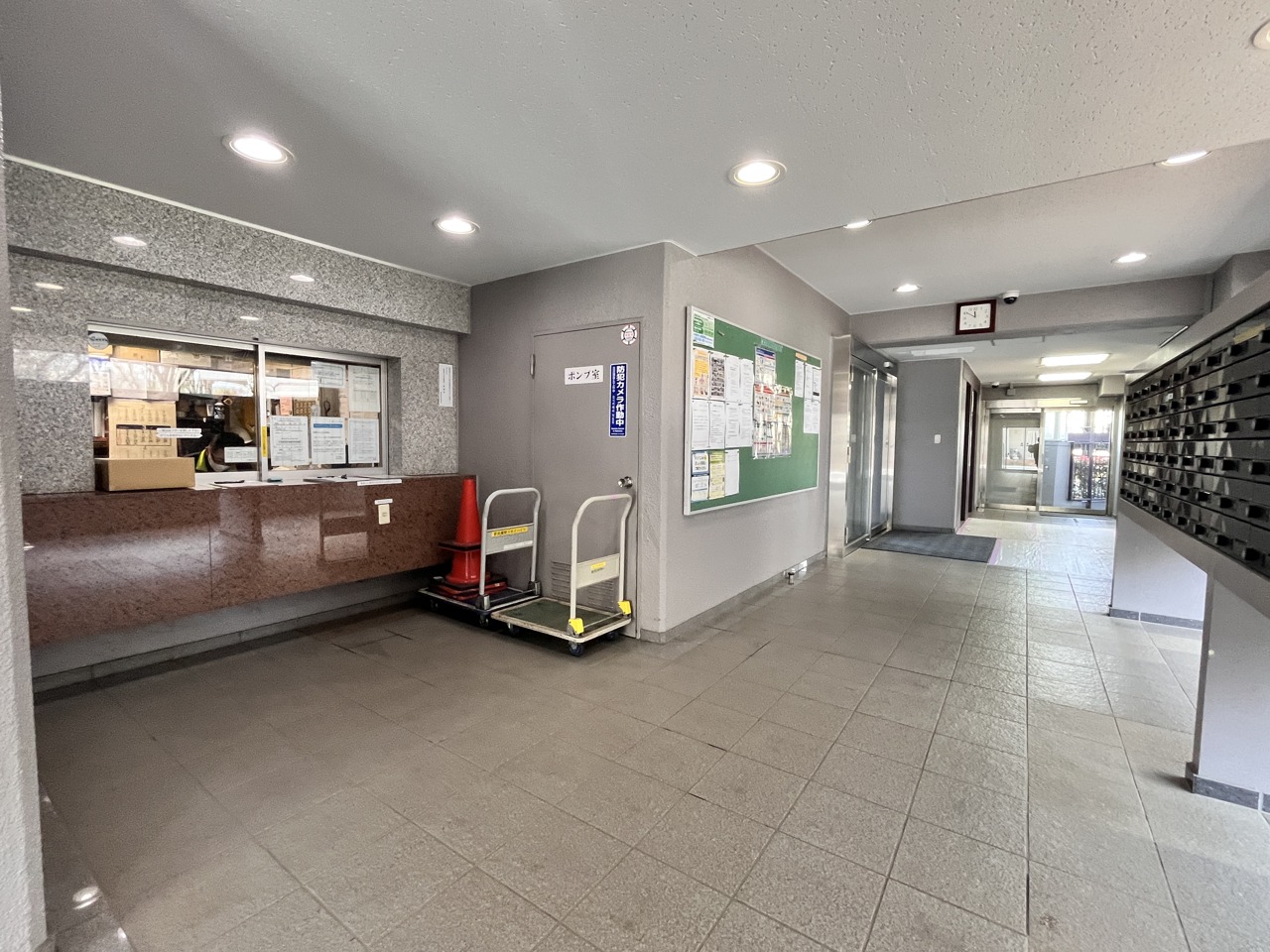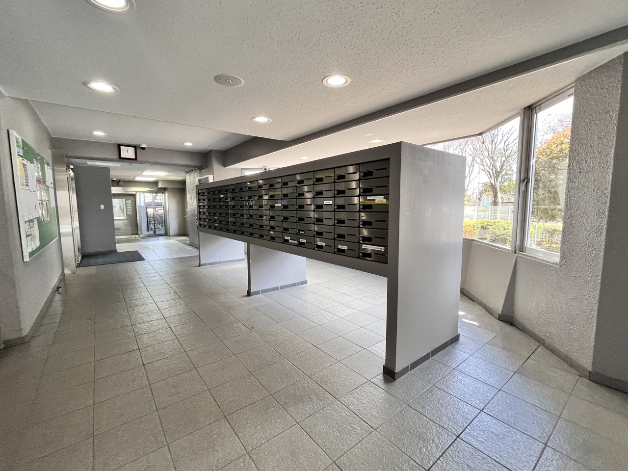 柔らかな光が広がるエントランスは、日々の暮らしに穏やかな安らぎをもたらす空間。整然と並ぶ郵便受けは、都会的な洗練された印象を与え、住まう方々の生活を静かに支えています。窓の外には季節の移ろいを感じさせる木々が、穏やかな風景を描いています