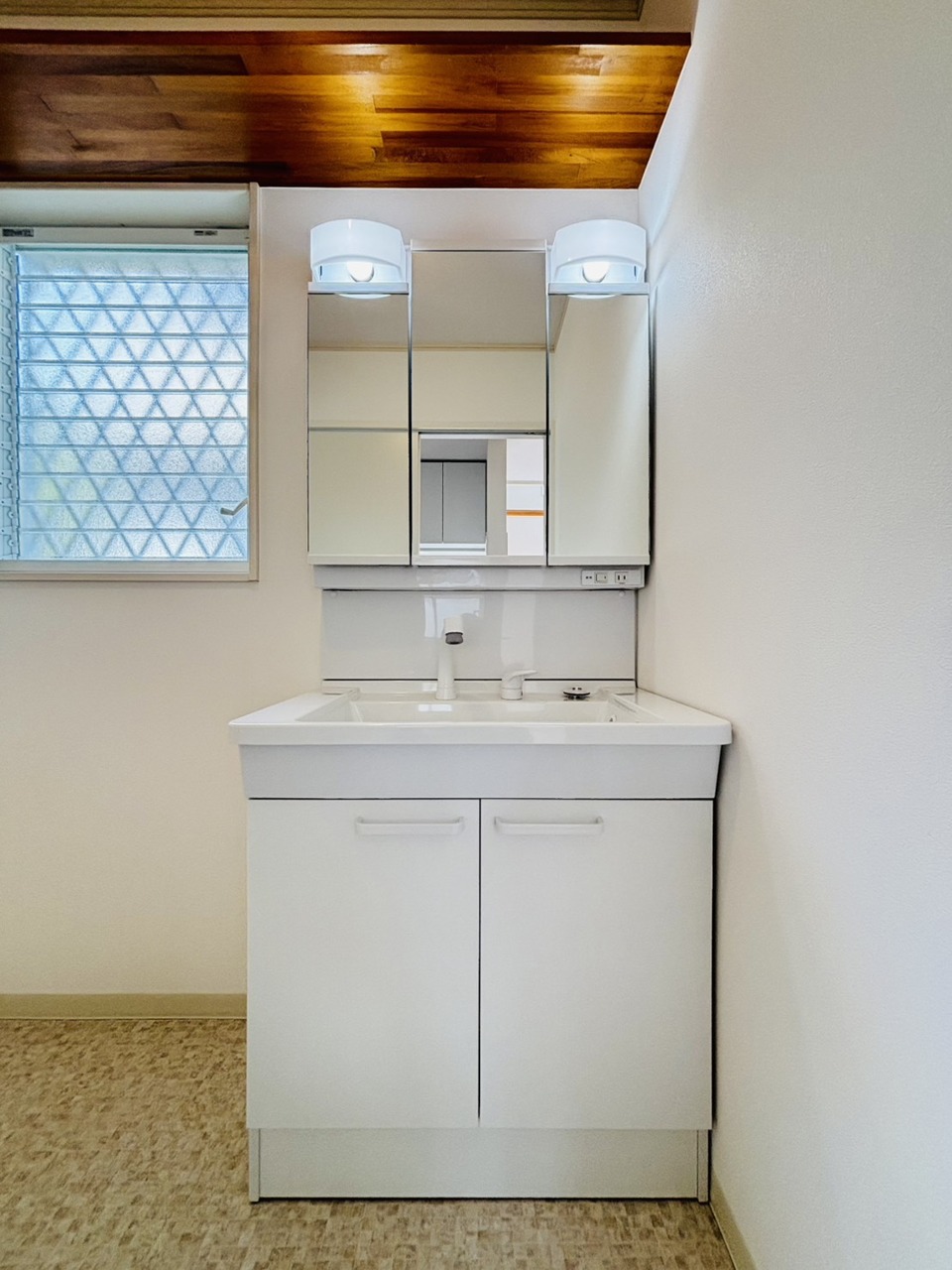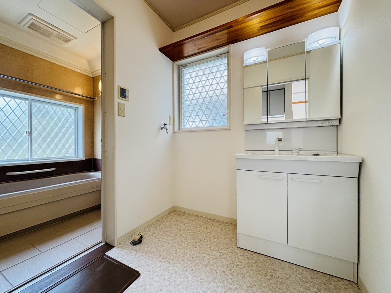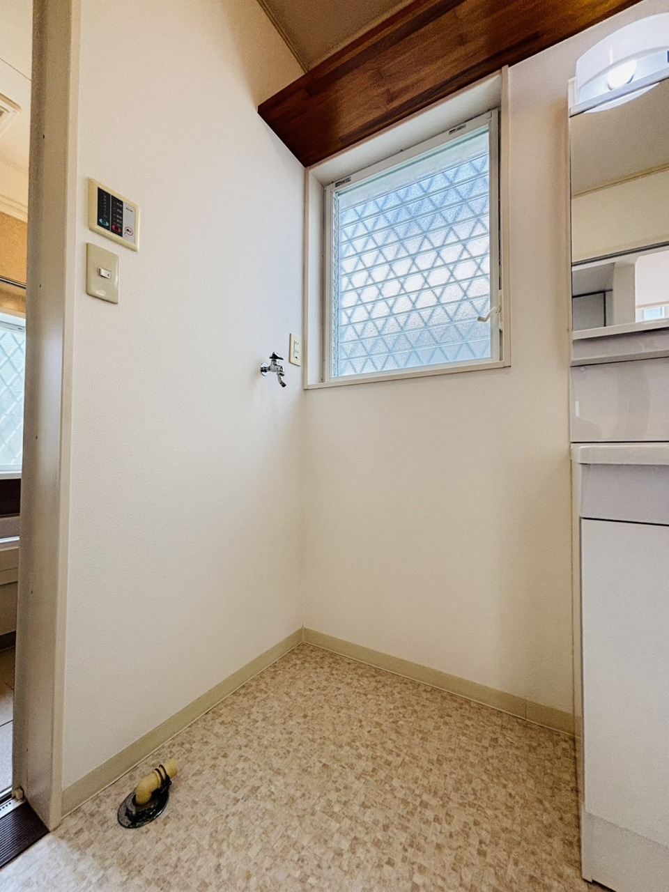 洗面台横にランドリーコーナーもゆったり。ドラム式洗濯機も置けそう。
