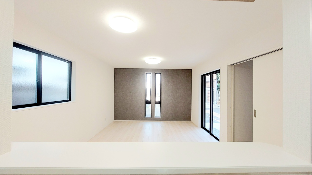 家族や友人、両親、親戚とこれから沢山の時間を紡ぐのだろう。そこを彩るのは窓から見える青い空、心地よい緑。そんなイメージが膨らむリビングスペース。