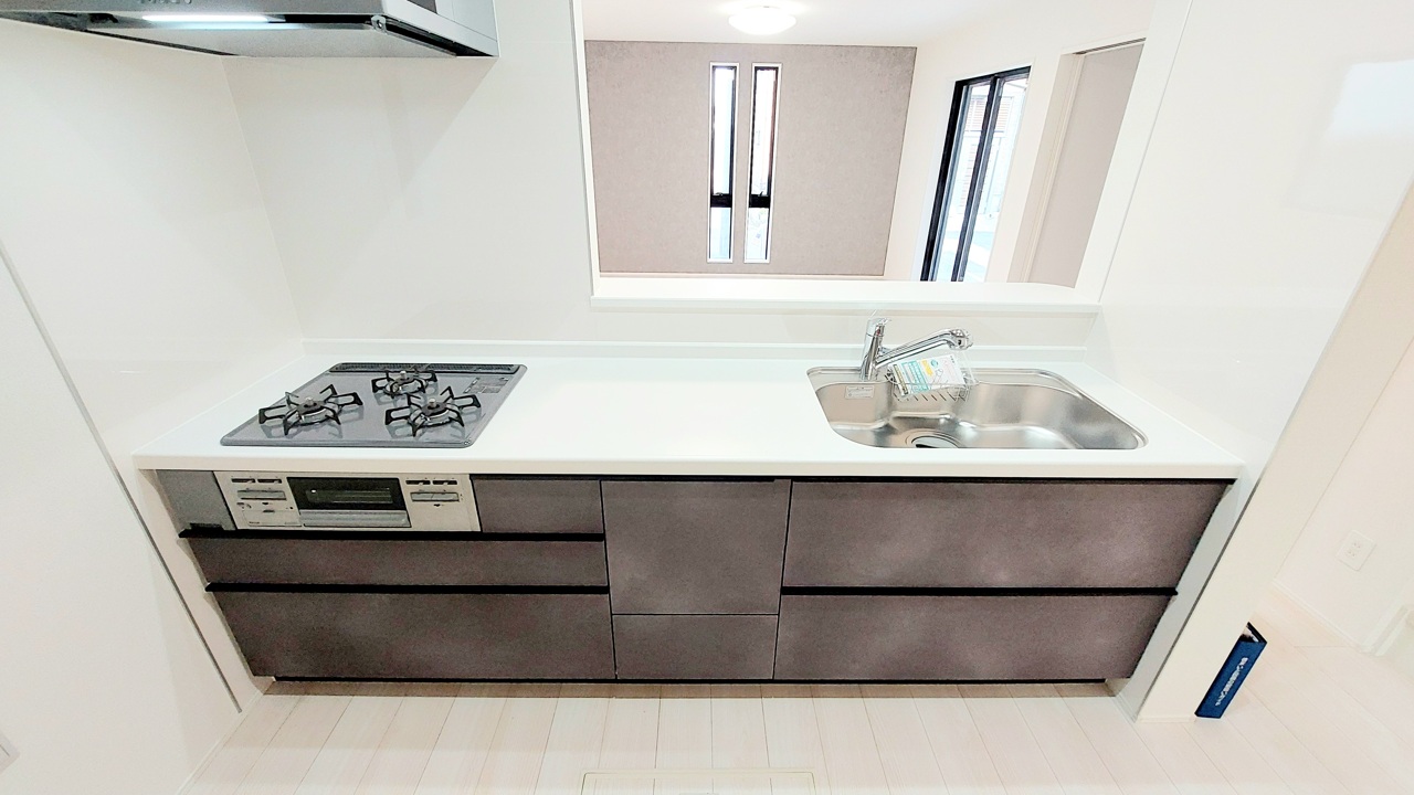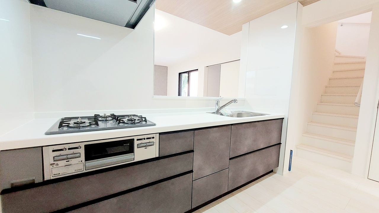 リビングにいる家族の顔が見渡せるカウンターキッチン。お料理もより一層おいしく、楽しく。食器棚を背面に設置しても十分な広さを確保しています。
