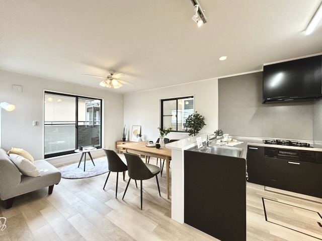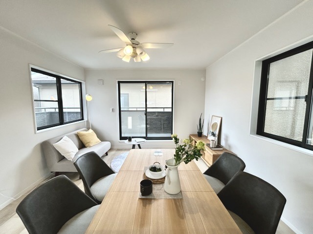 家族団欒のリビング。陽光差し込む食卓には家族の会話とスマイルが溢れます。いつまでもここで食卓を囲みたくなる、そう感じさせてくれるスペース。
