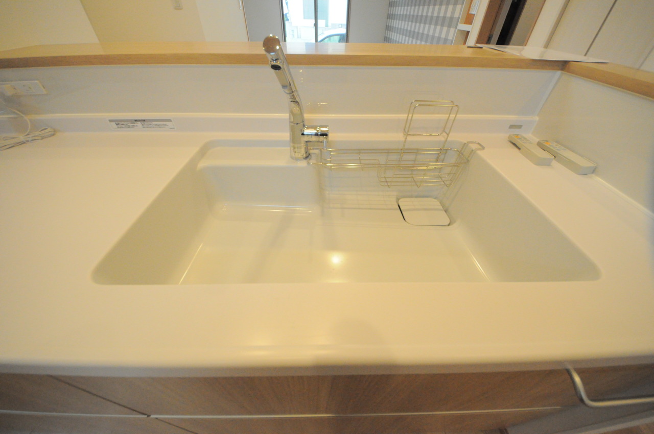 人工大理石を使用したシステムキッチン。永く傷つきにくく、お手入れもしやすい高機能性です。