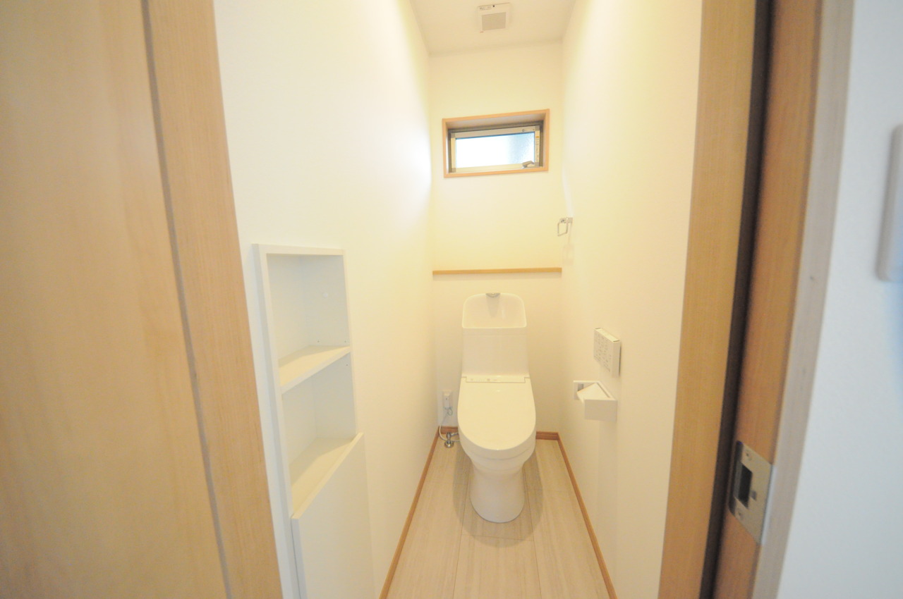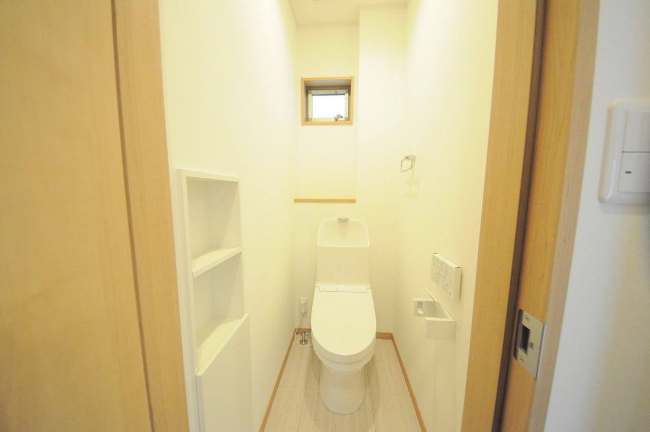 ウォシュレット機能付きのトイレ。換気のしやすい窓付きで、収納もあり実用性も兼ね備えた造り。