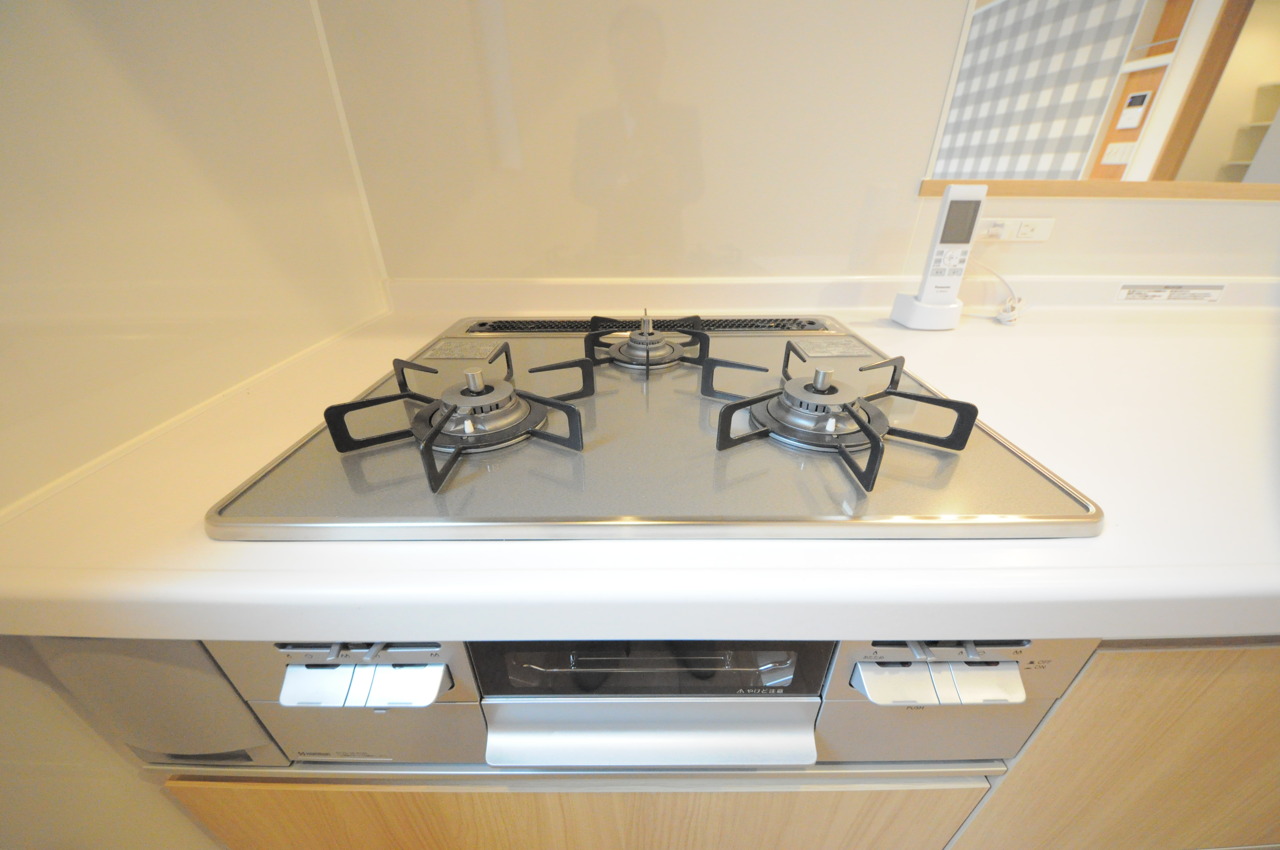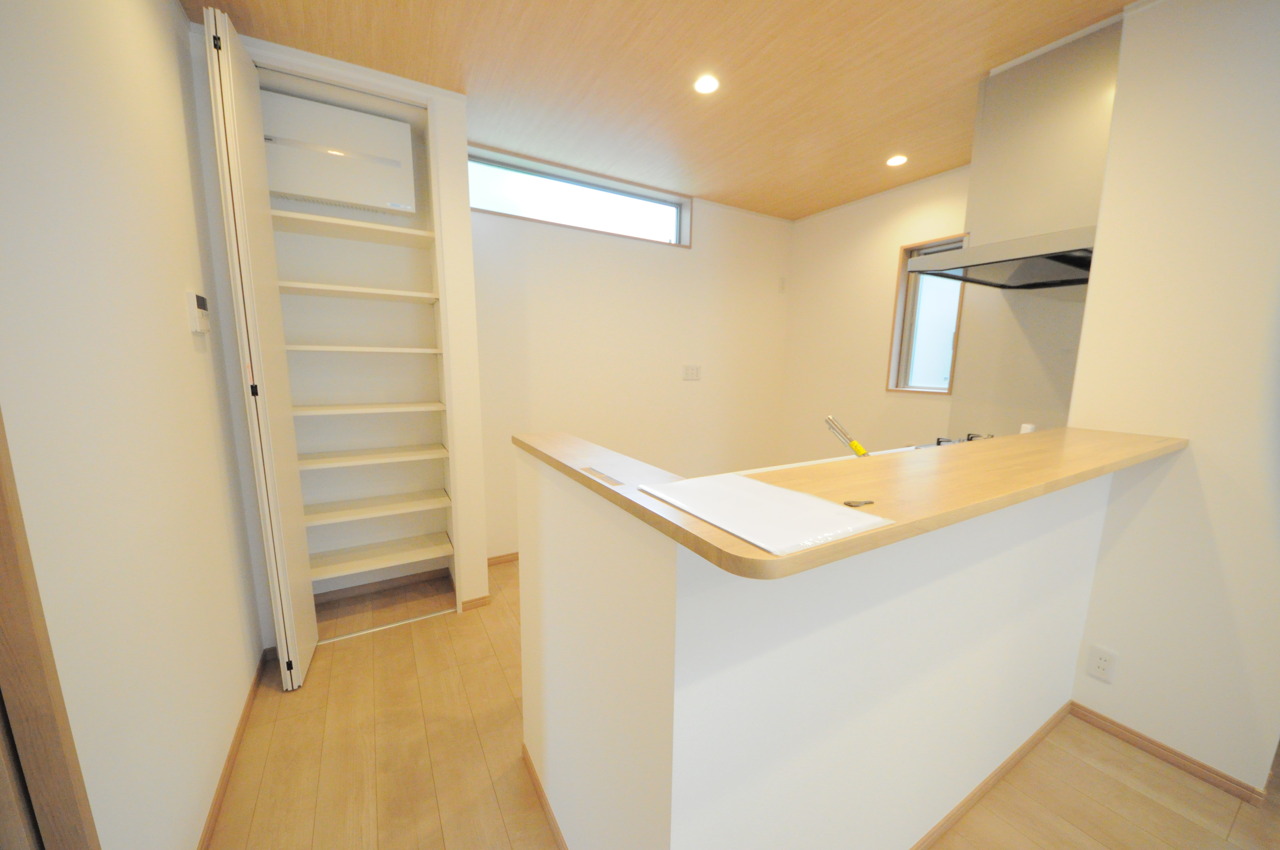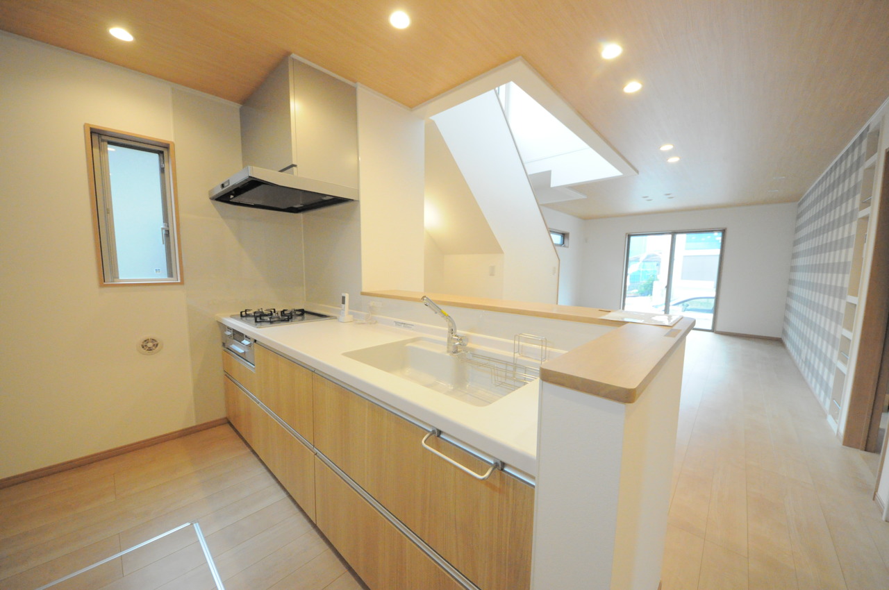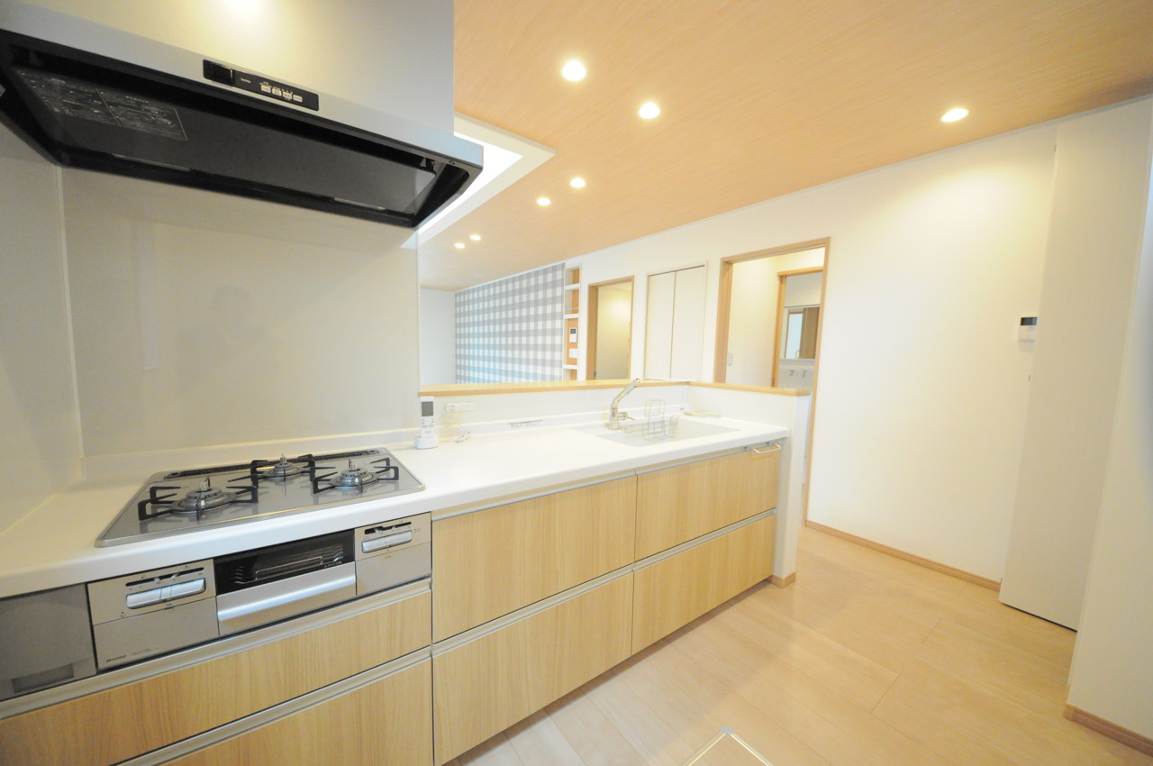 リビングにいる家族の顔が見渡せるカウンターキッチン。お料理もより一層おいしく、楽しく。食器棚を背面に設置しても十分な広さを確保しています。