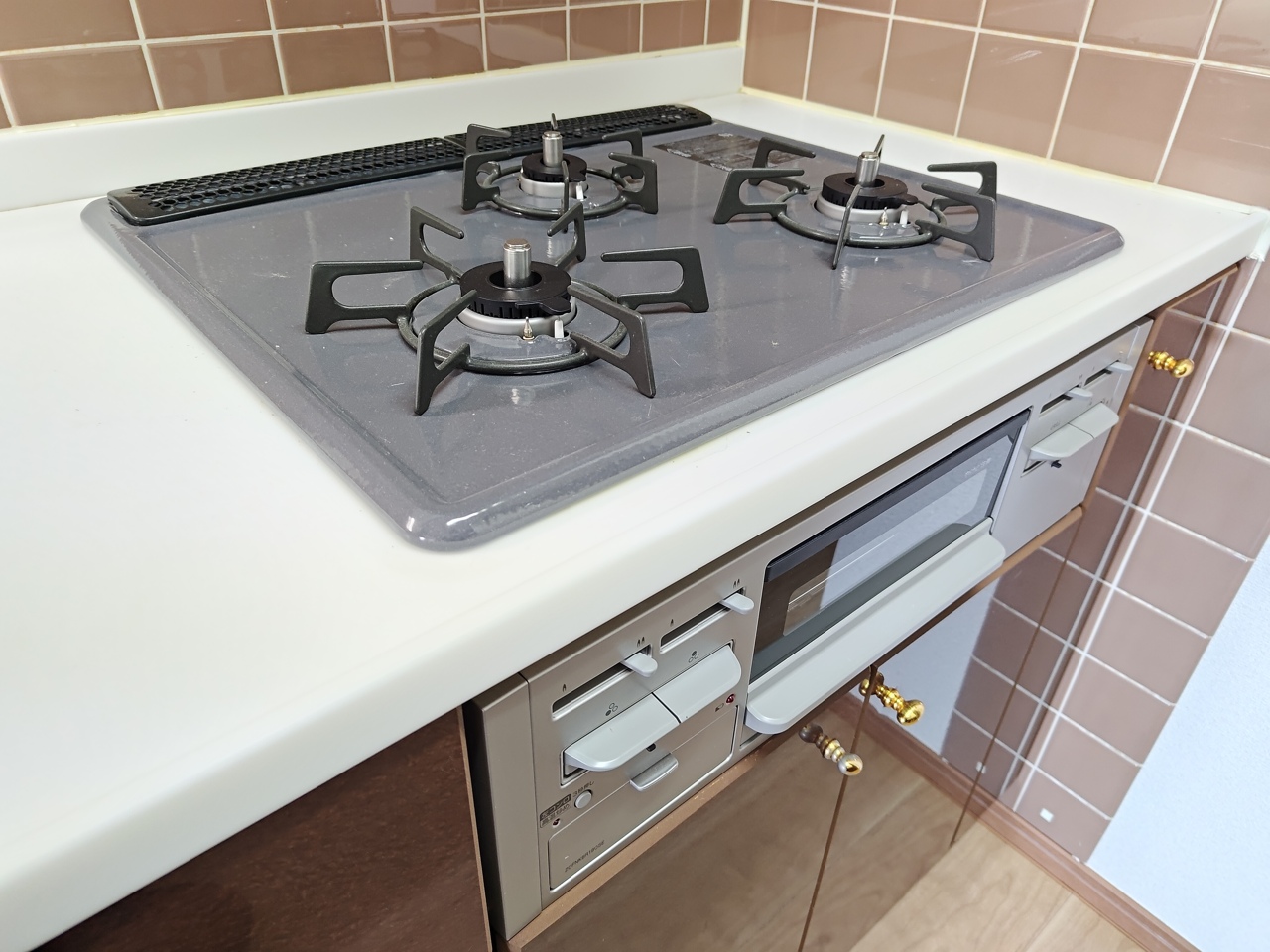 ビルトイン型コンロ&グリル。 3口あれば、大きなフライパンを使いながら横でお湯を沸かせます!