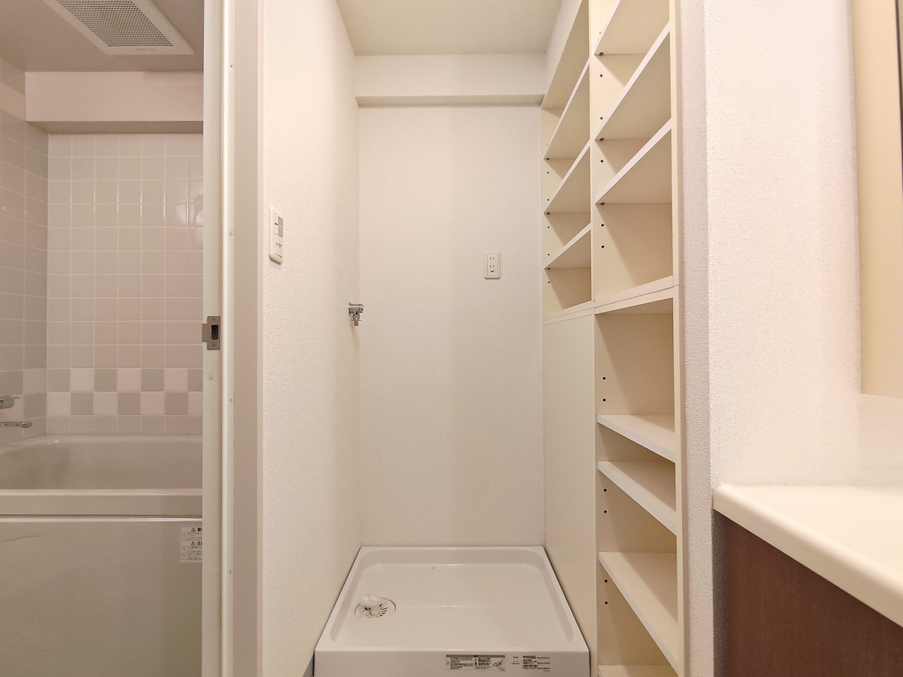 洗濯機置き場の足元に設置された防水パンは、洗濯機運転中の振動・騒音を抑えてくれます。