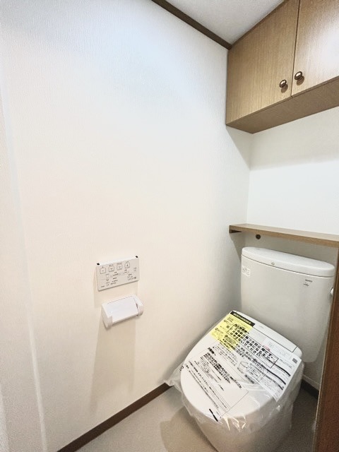 ウォシュレット機能付きのトイレ。収納もあり実用性も兼ね備えた造り。