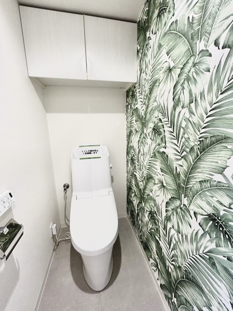 ウォシュレット機能付きのトイレ。収納もあり実用性も兼ね備えた造り。