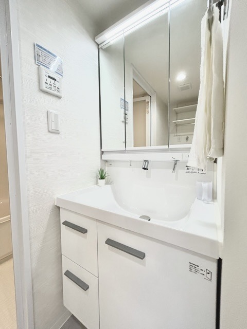 お出かけ前の身だしなみに一歩差がつく三面鏡。ミラー裏にはたっぷり収納もございます。