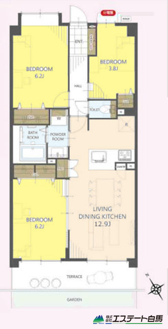 | 間取 | 3LDK (洋室6.2帖、洋室3.8帖、LDK12.9帖、洋室6.2帖) | ||