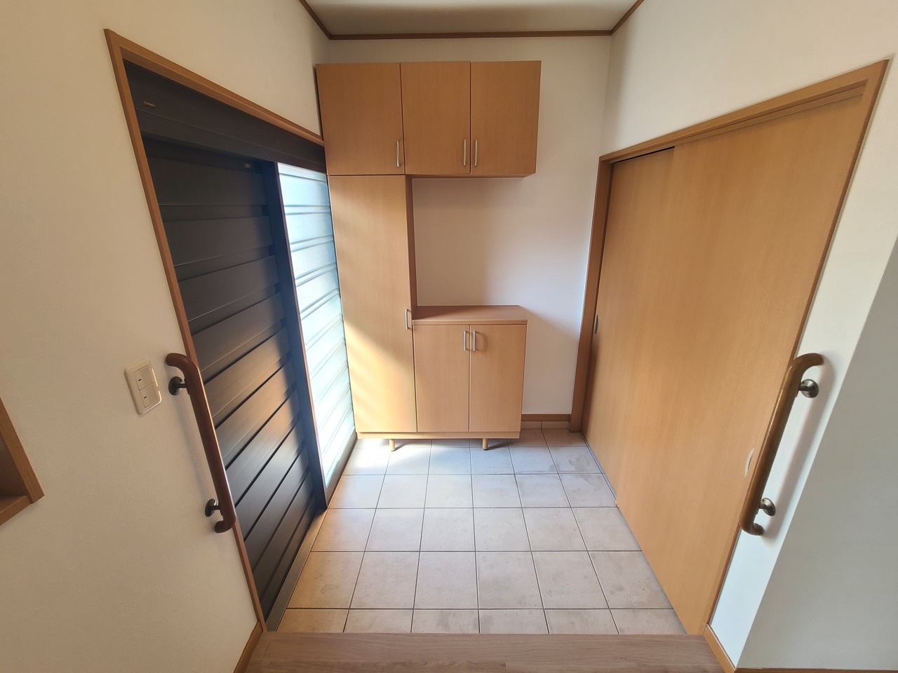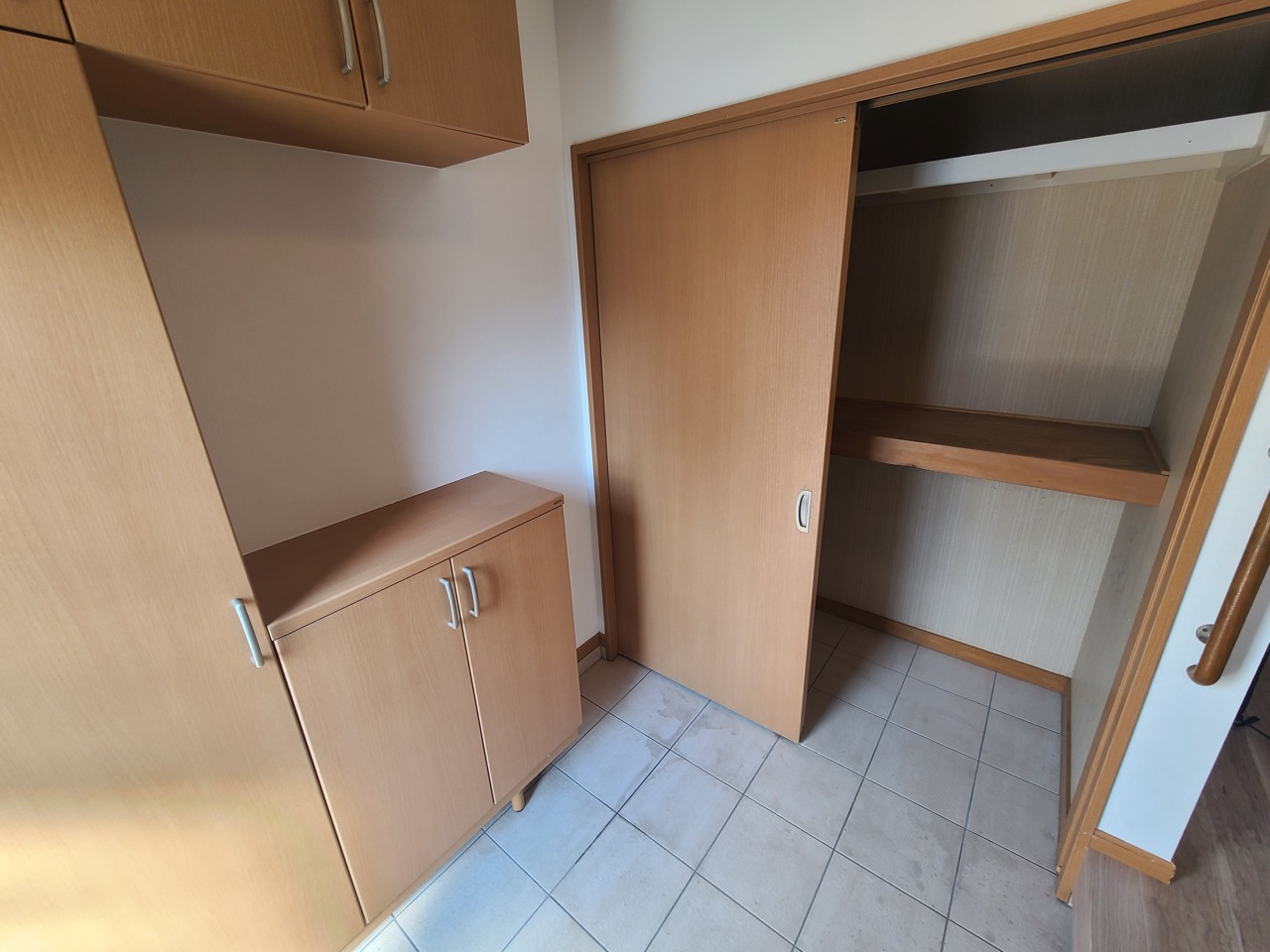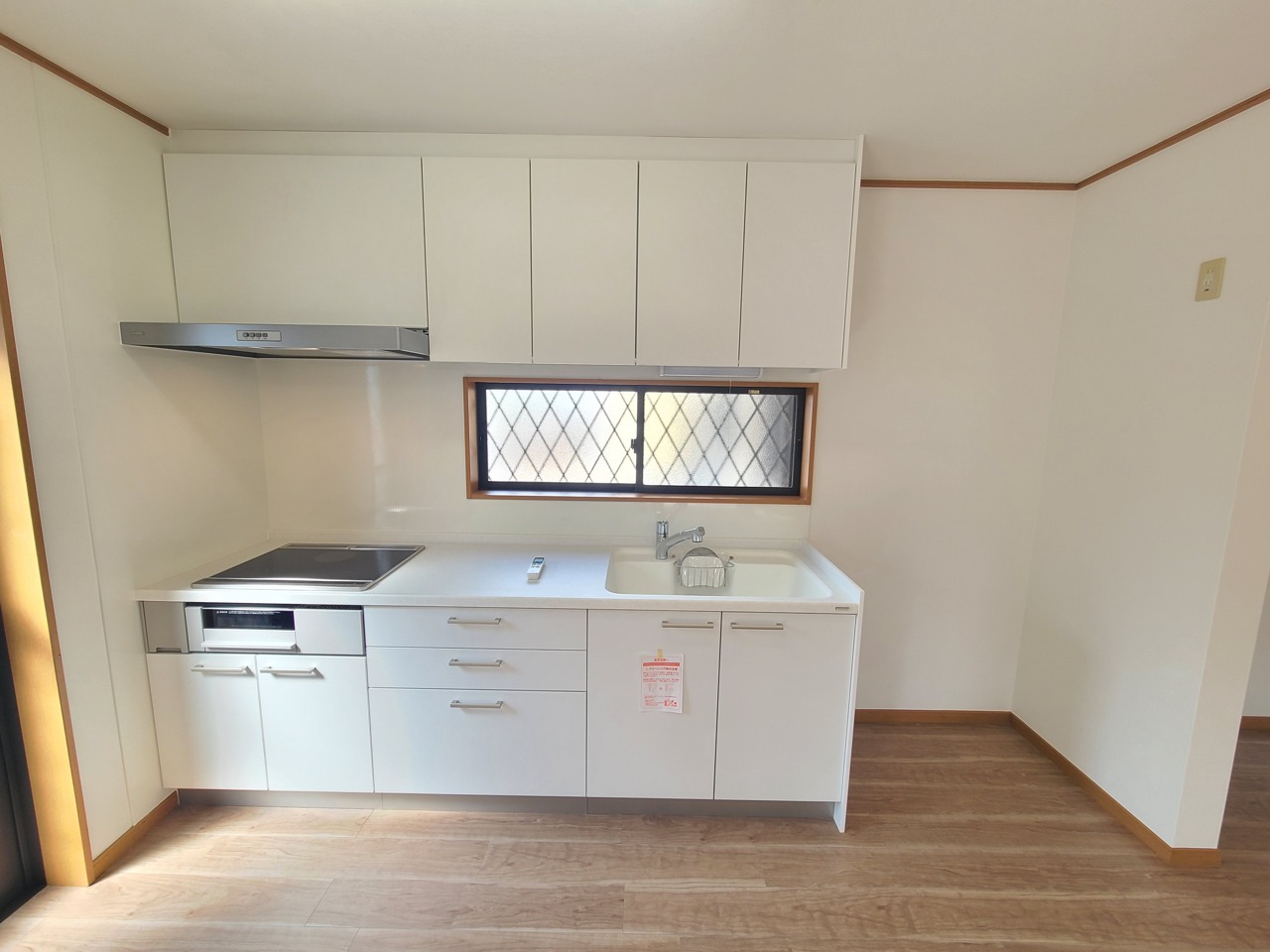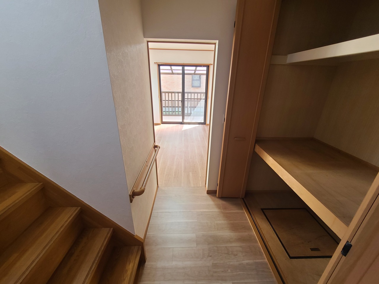 明るい木目調の収納と、すっきりとした空間が心地よい印象。