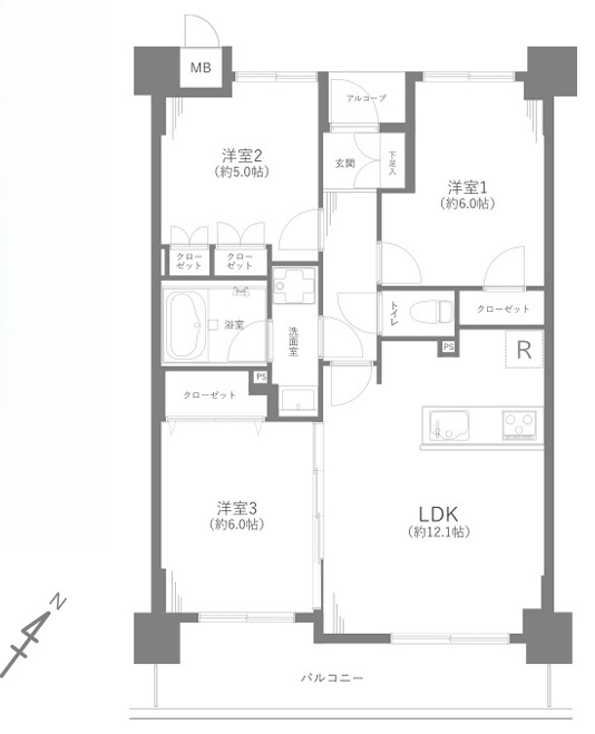 | 間取 | 3LDK (LDK12.1帖、洋室6.0帖、洋室6.0帖、洋室5.0帖) | ||