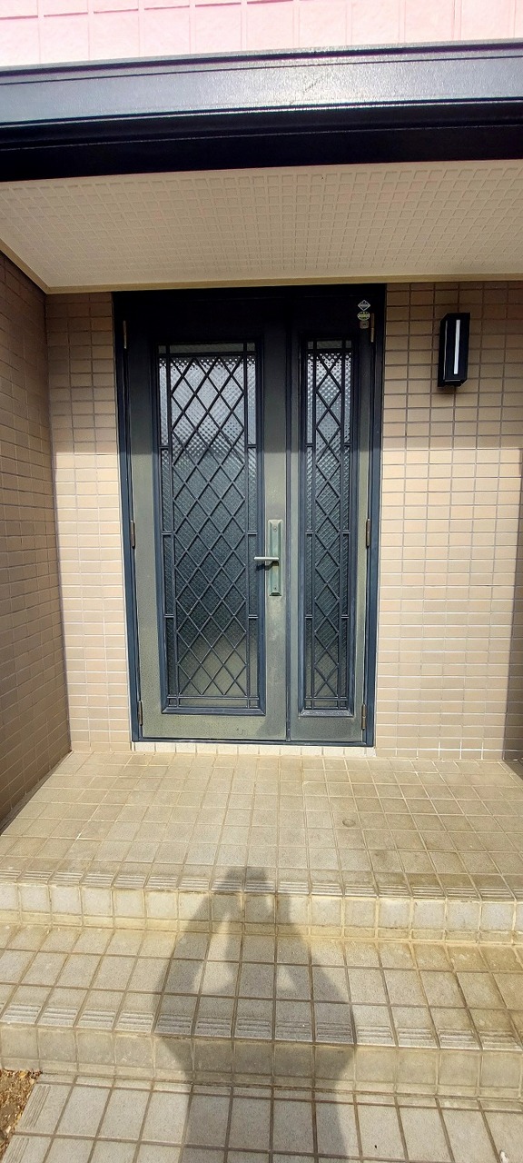 温かみのあるタイルと、重厚感のある玄関ドアが印象的。