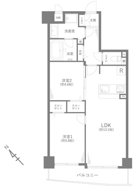 | 間取 | 2LDK (洋室5.8帖、洋室4.6帖、LDK13.1帖) | ||