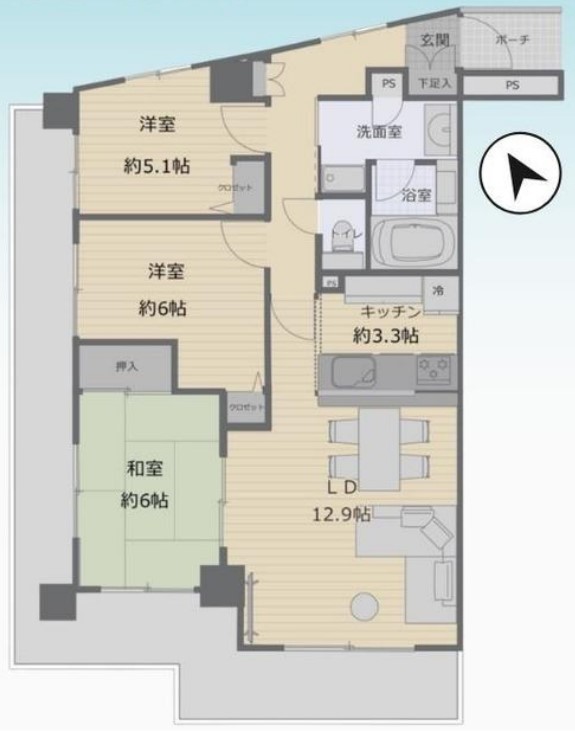 | 間取 | 3LDK (洋室5.1帖、洋室6帖、和室6帖、LD12.9帖、K3.3帖) | ||