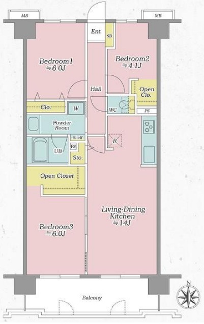 | 間取 | 3LDK (LDK14帖、洋室6.0帖、洋室6.0帖、洋室4.1帖) | ||