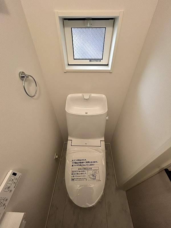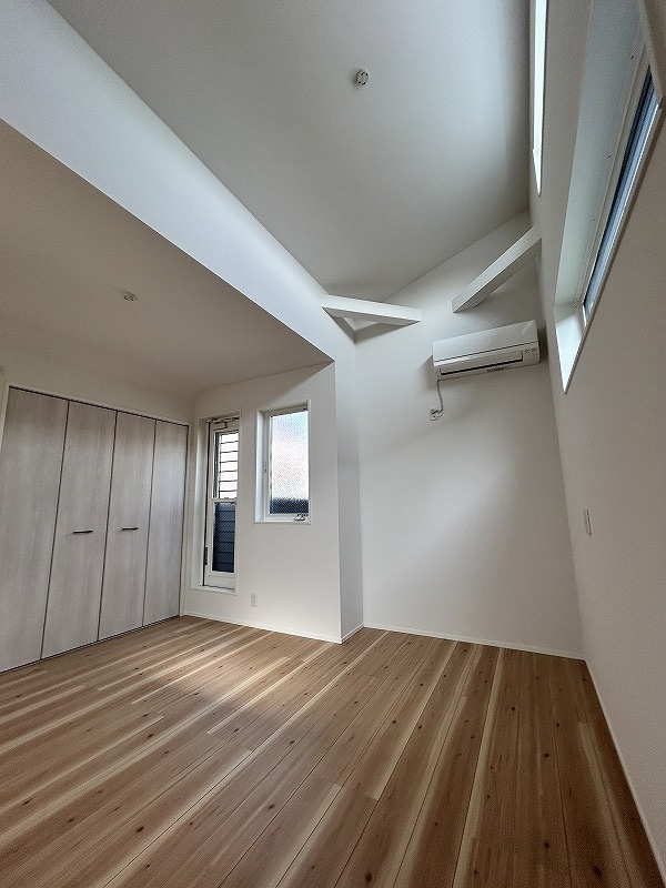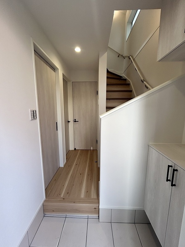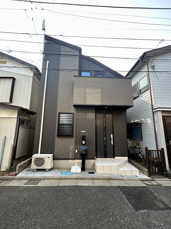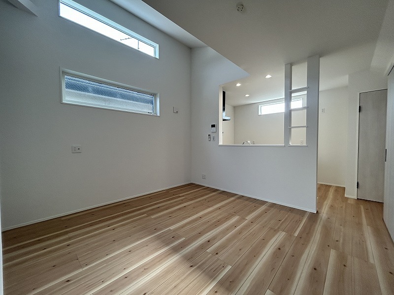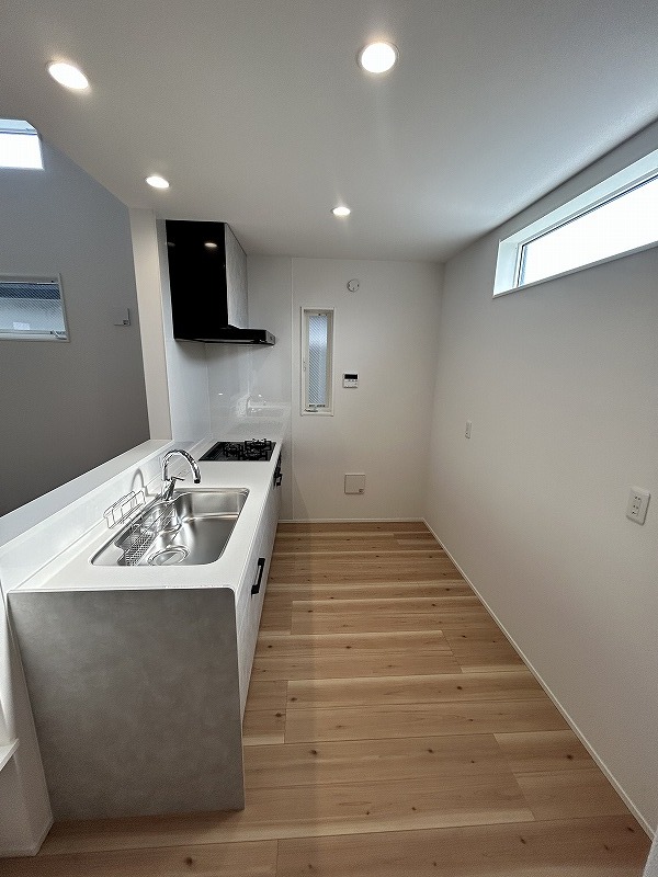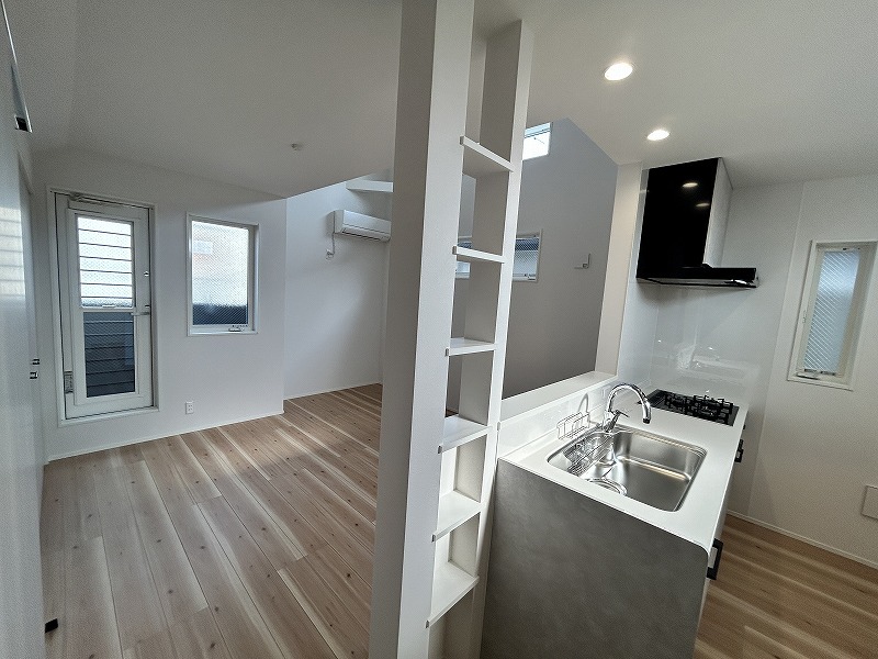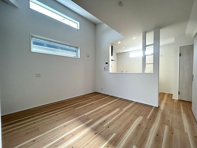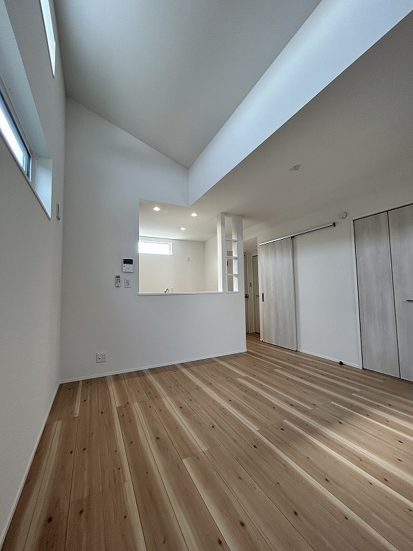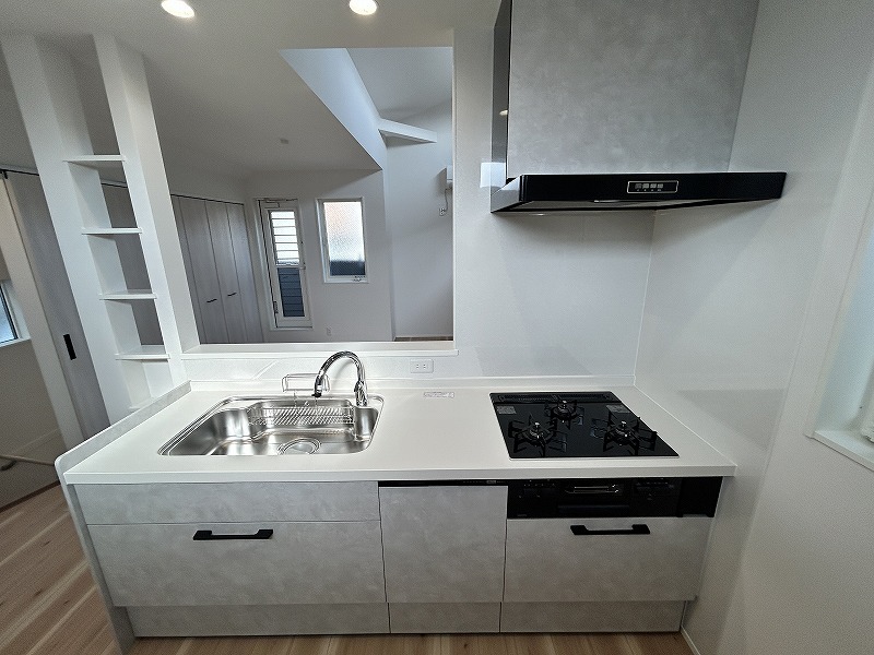 閑静な住宅地に佇むコンパクトサイズの新築戸建、カウンターキッチンと上部吹抜け勾配天井のある開放的なレイアウト、食洗器や浴室乾燥機など設備も充実。