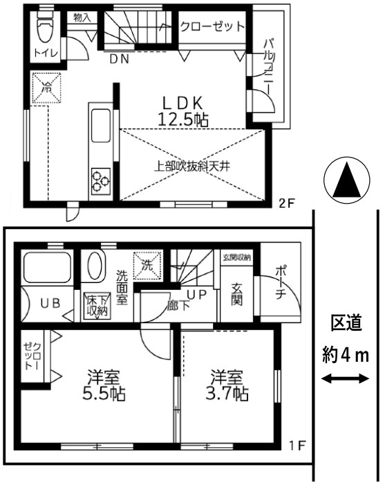 | 間取 | 2LDK (LDK12.5帖、洋室5.5帖、洋室3.7帖) | ||
