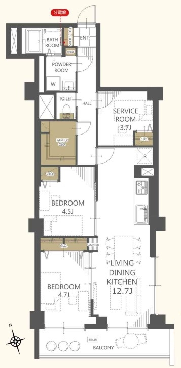 | 間取 | 2SLDK (LDK12.7帖、洋室4.7帖、洋室4.5帖、S3.7帖) | ||