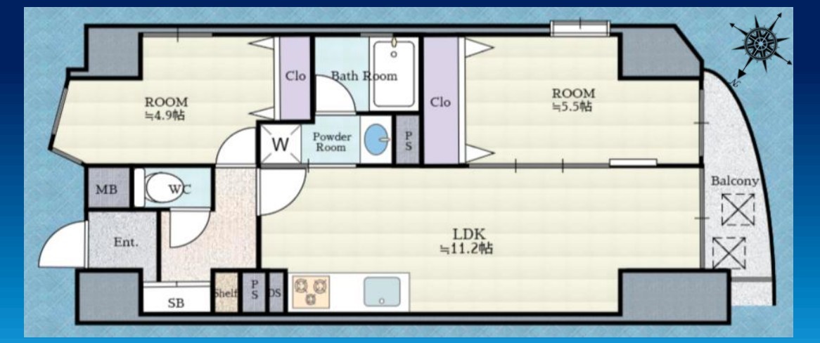 | 間取 | 2LDK (LDK11.2帖、洋室5.5帖、洋室4.9帖) | ||