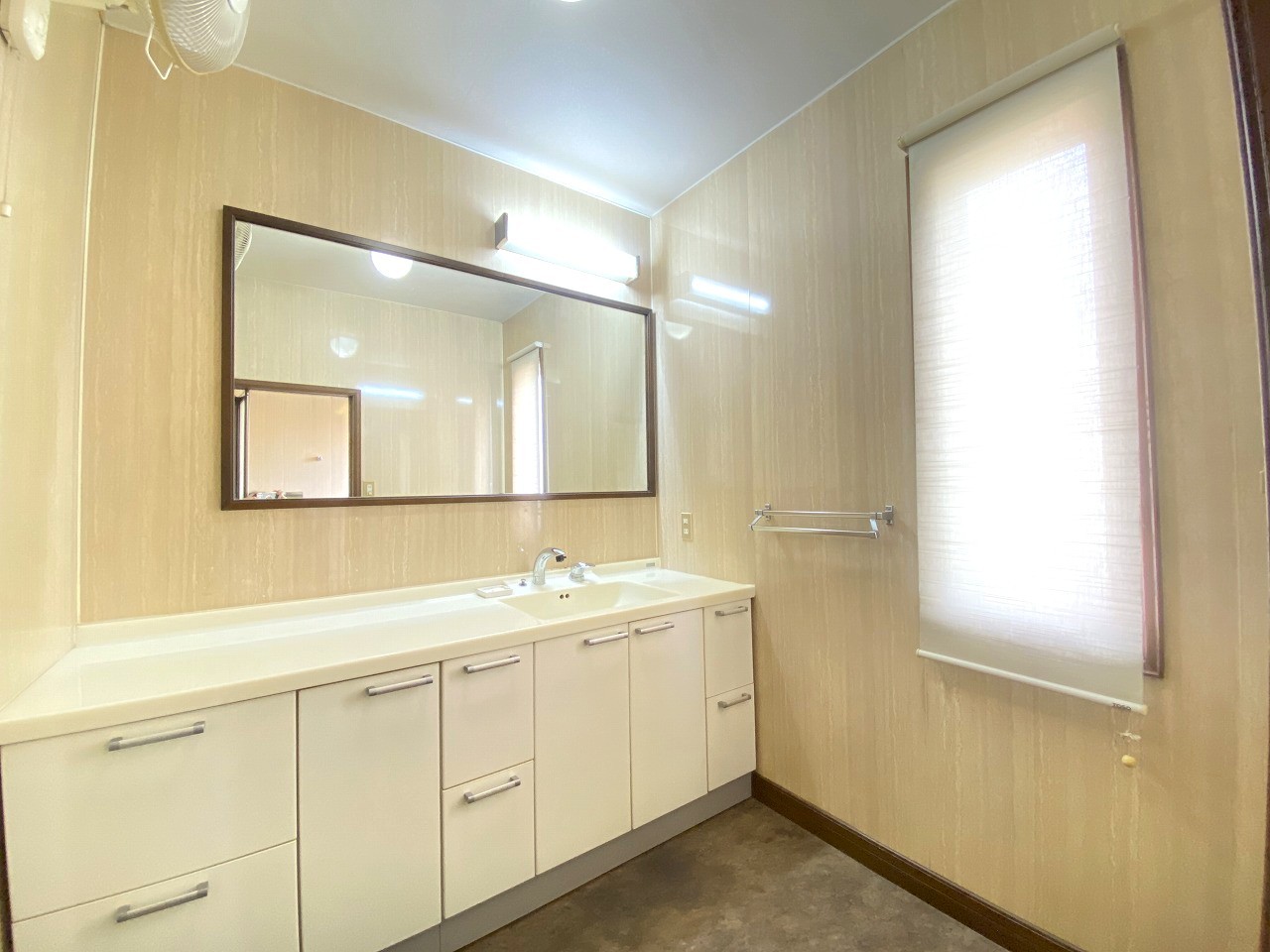 注文住宅ならではの広く、鏡の大きな洗面化粧台。収納スペースもしっかり備わっております。