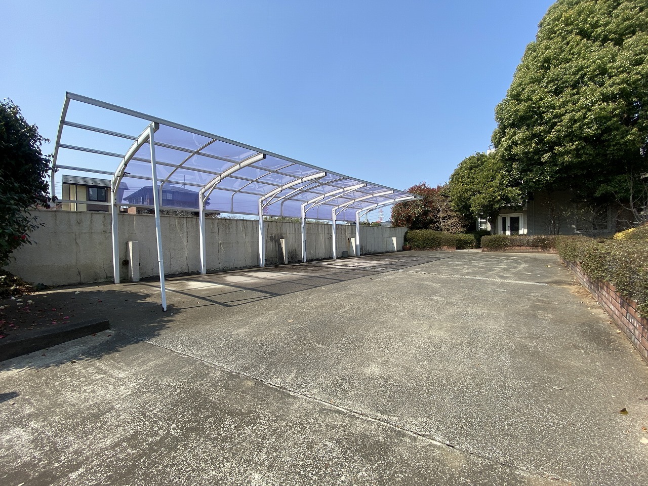 駐車場は広々としていて気持ちがいいです。小さなお子様も、この季節なら水遊びや遊具を置いて、車がない時間は安全に遊べそうです。