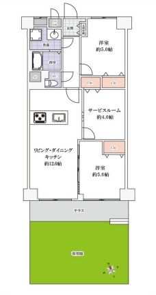 | 間取 | 2SLDK (LDK12.6帖、洋室5.6帖、洋室5帖、S4帖) | ||