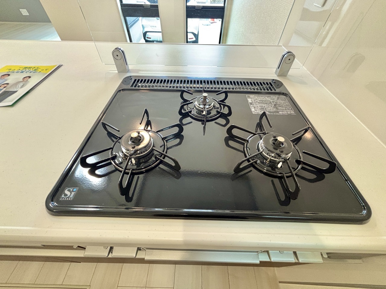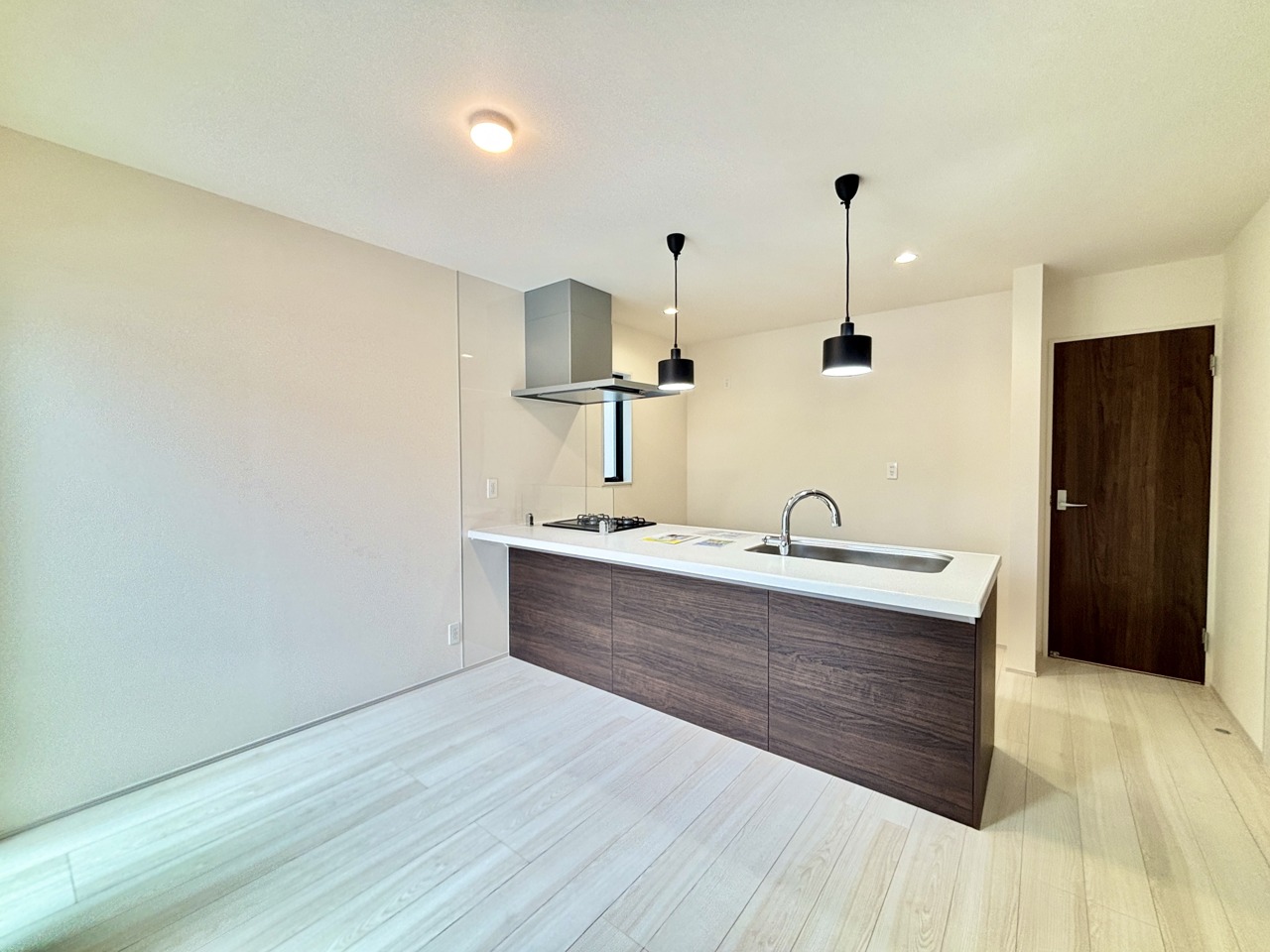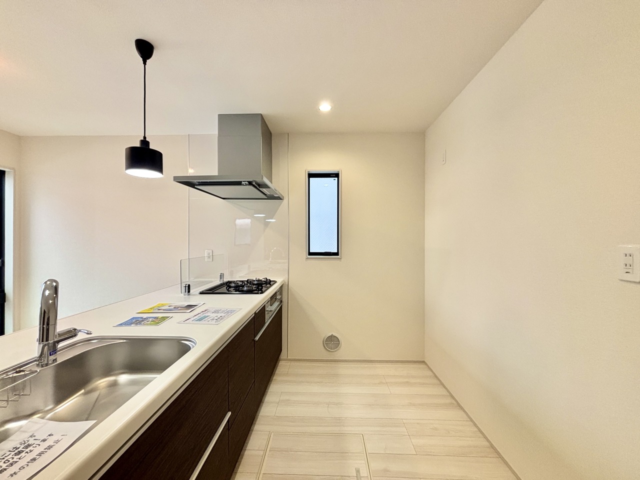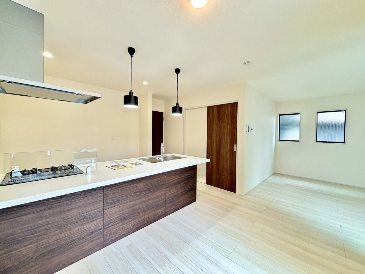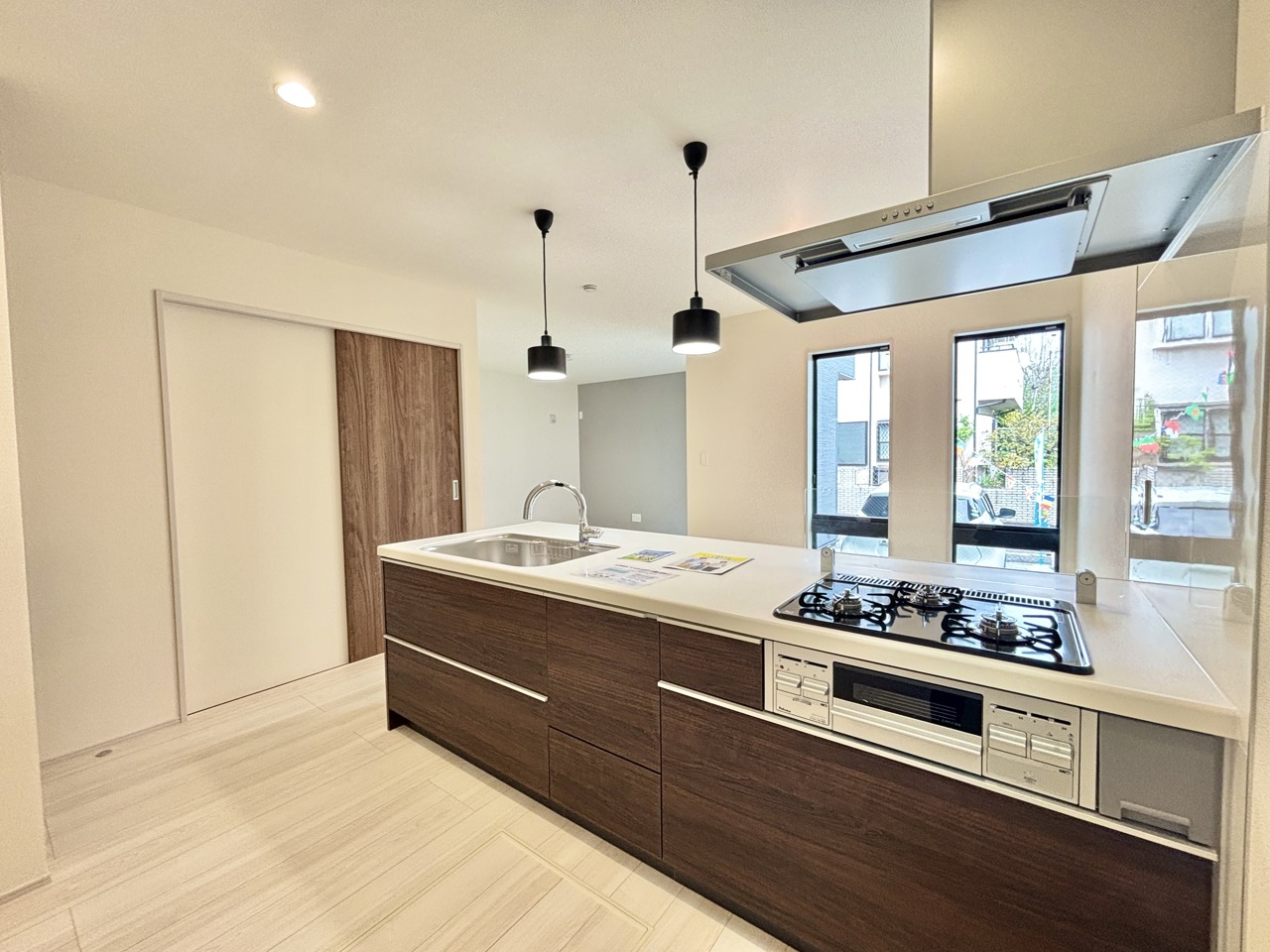 リビングにいる家族の顔が見渡せるカウンターキッチン。お料理もより一層おいしく、楽しく。食器棚を背面に設置しても十分な広さを確保しています。