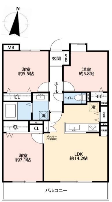 | 間取 | 3LDK (LDK14.2帖、洋室7.1帖、洋室5.8帖、洋室5.5帖) | ||